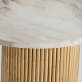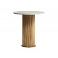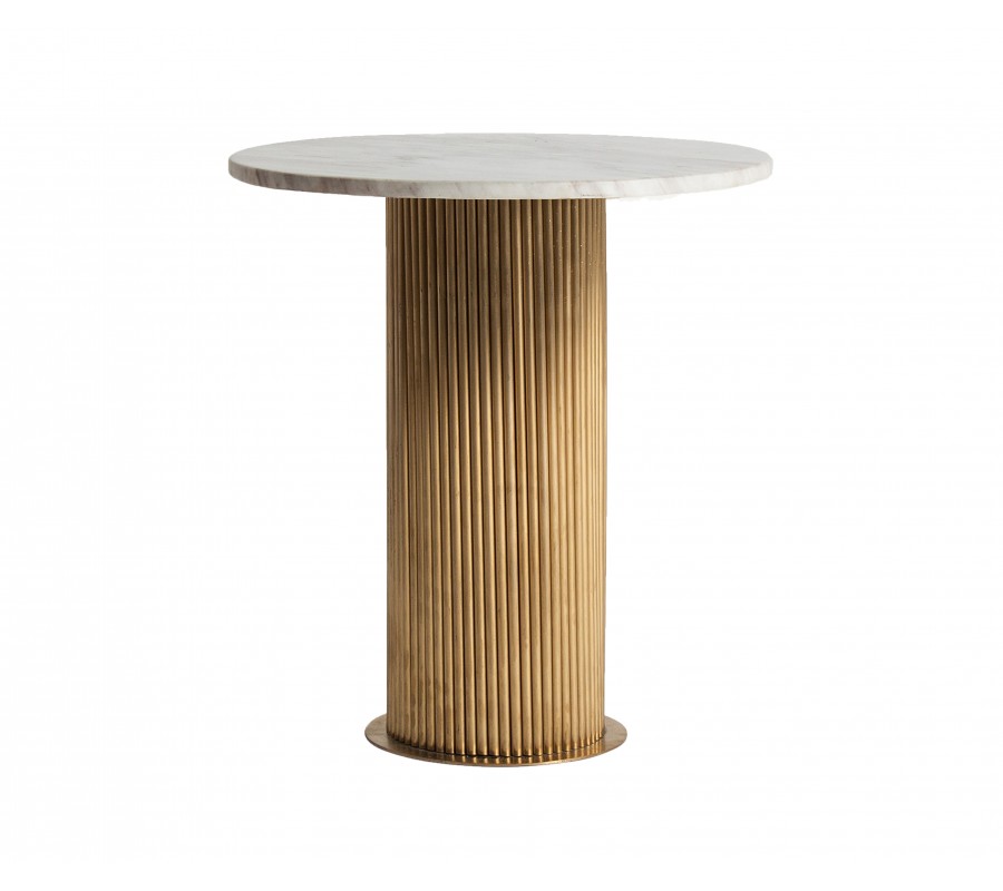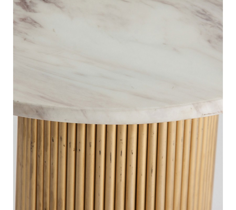 Základ tvorí valcová konštrukcia z kovu v zlatej farbe, vytvorená z jemných vertikálnych tyčí, ktoré vytvárajú rytmický, dekoratívny efekt. Stolík je zakončený tenkou okrúhlou podstavou, ktorá zaisťuje stabilitu a zároveň optickú ľahkosť celku.