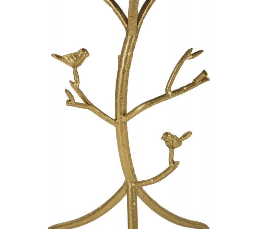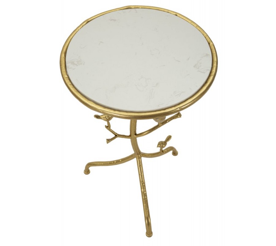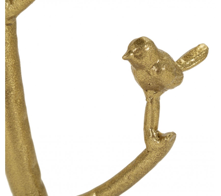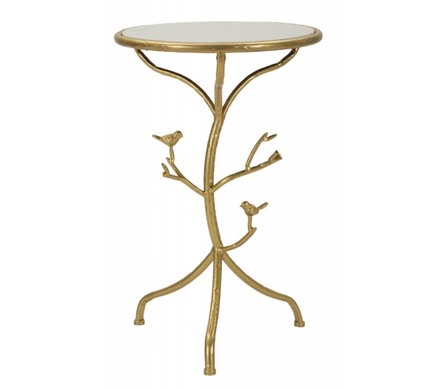 Dizajnový glamour príručný stolík Natura Elegante v okrúhlom tvare zaujme svojím poetickým vzhľadom a originálnym spracovaním. Jeho kovová konštrukcia v zlatej farbe je tvarovaná do podoby vetvy s jemne zakrivenými výbežkami a tromi detailne spracovanými vtáčikmi, ktoré pôsobia ako živé. Centrálna noha sa prirodzene rozvetvuje do troch stabilných nôh, ktoré pripomínajú korene stromu, čím vzniká harmonický a sochársky dojem.