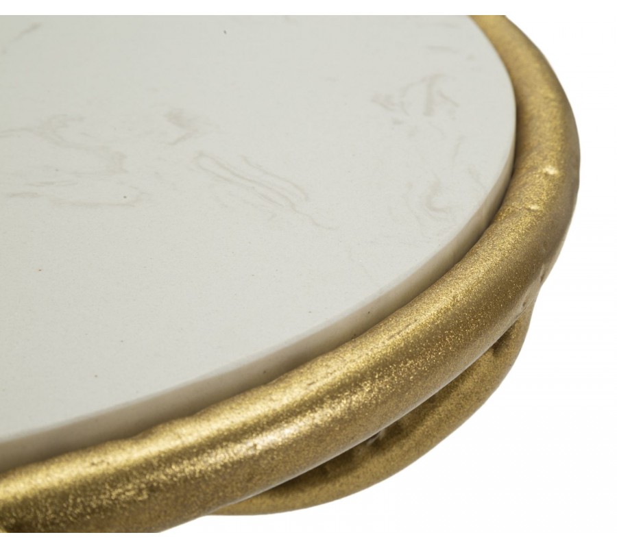 Vrchná doska je okrúhla a má elegantný biely mramorový dizajn, ktorý vytvára príjemný kontrast so zlatou konštrukciou. Hladký povrch a zaoblený okraj dodávajú stolíku sofistikovaný vzhľad a praktickosť.