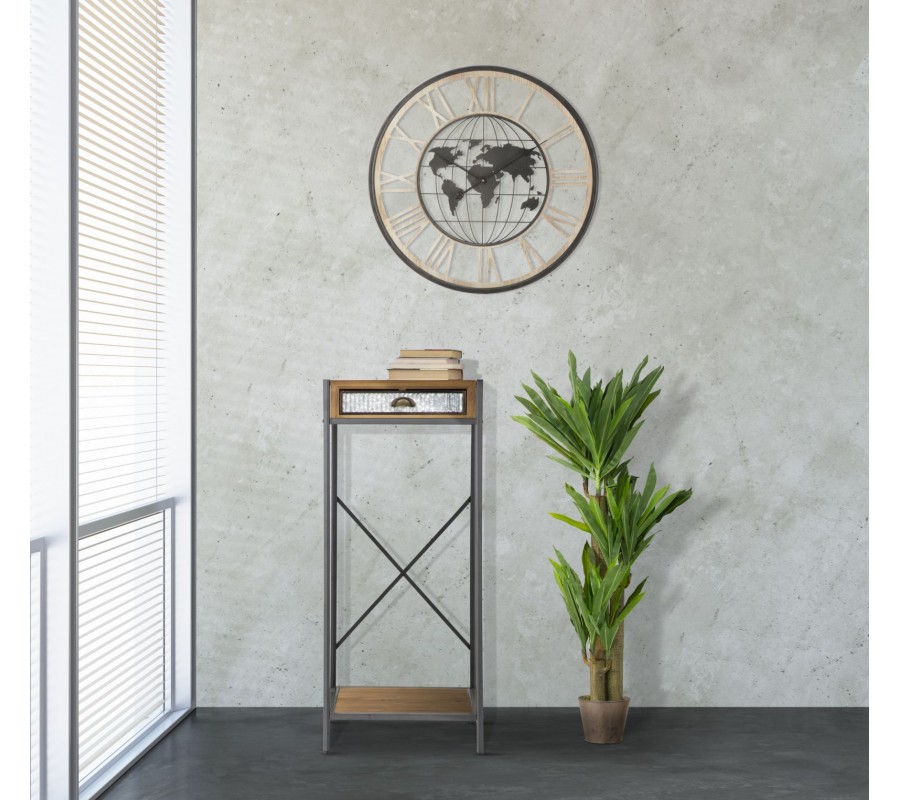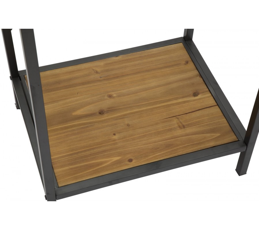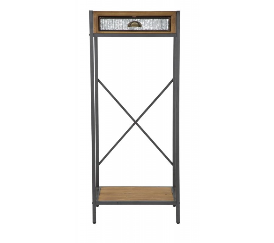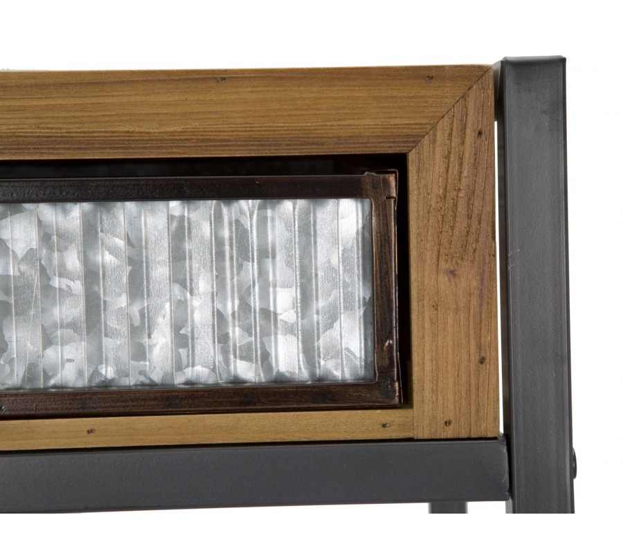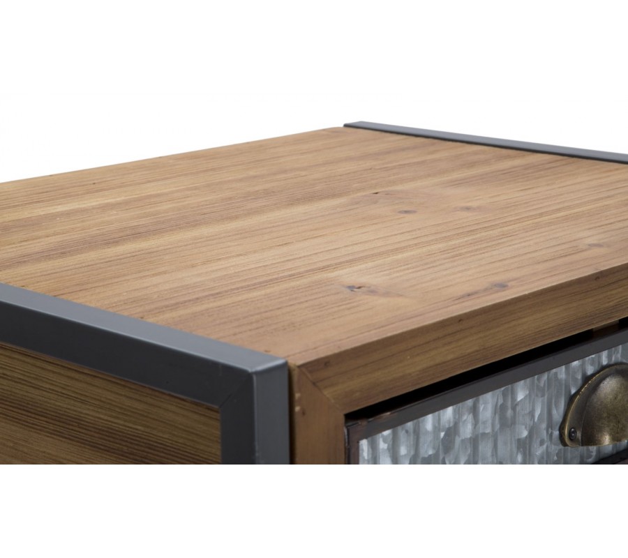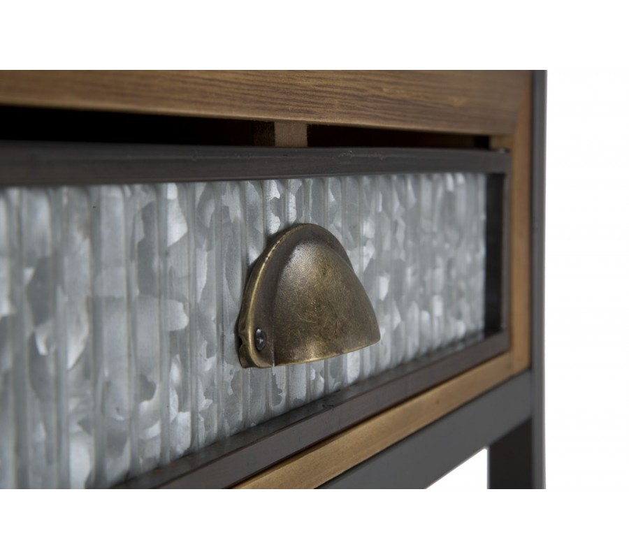 V hornej časti sa nachádza jedna praktická zásuvka, ktorej čelo tvorí zaujímavá kombinácia plechovej výplne s jemným reliéfom a rámu z prírodného dreva. Estetiku dotvára oblá kovová úchytka, ktorá evokuje industriálne rukoväte z minulého storočia. Dolná polica je vyrobená z masívneho dreva s prírodnou kresbou, čo vytvára harmonický kontrast k surovej kovovej konštrukcii.