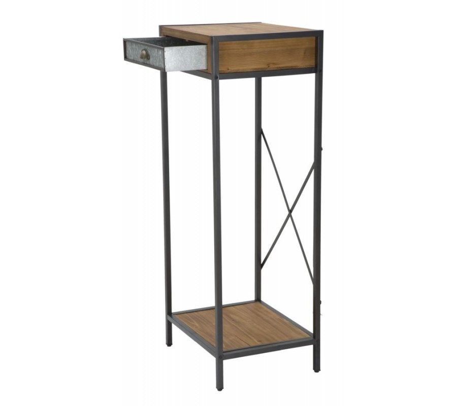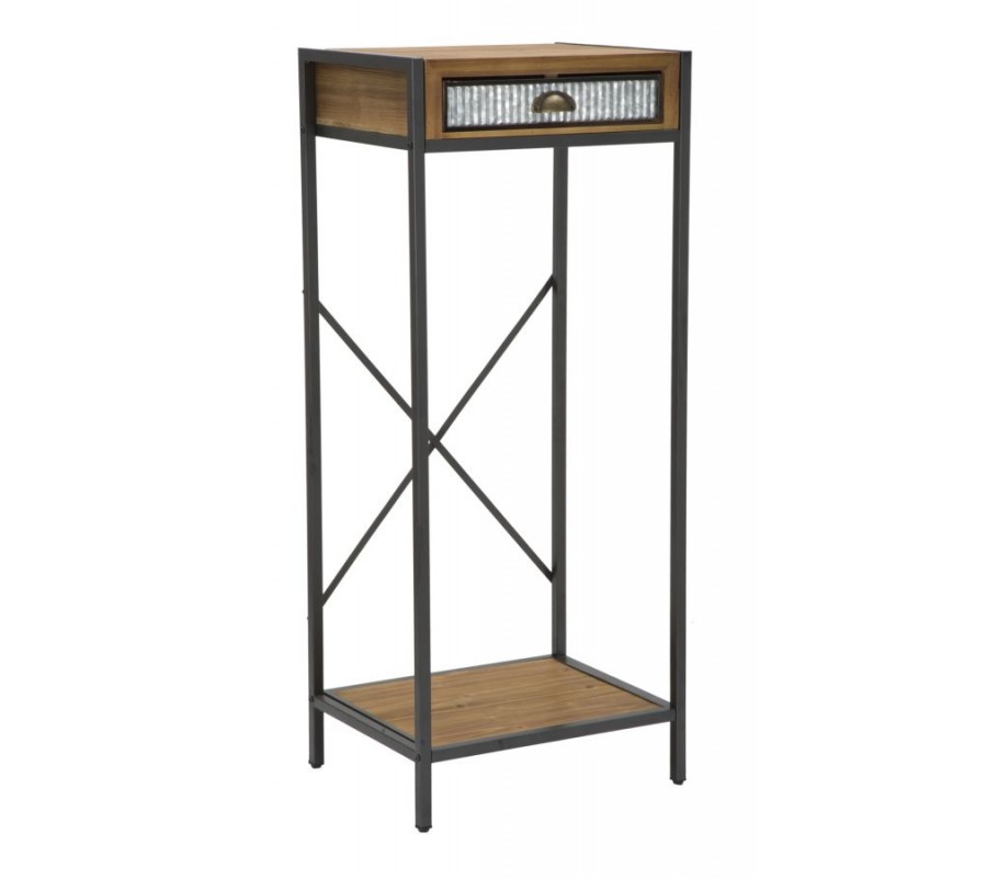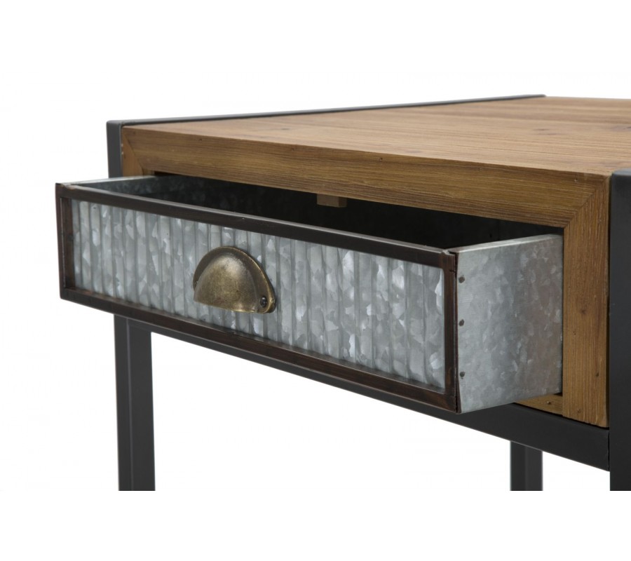 Štýlový industriálny príručný stolík Glady s drevenou policou a zásuvkou s plechovou výplňou 98 cm