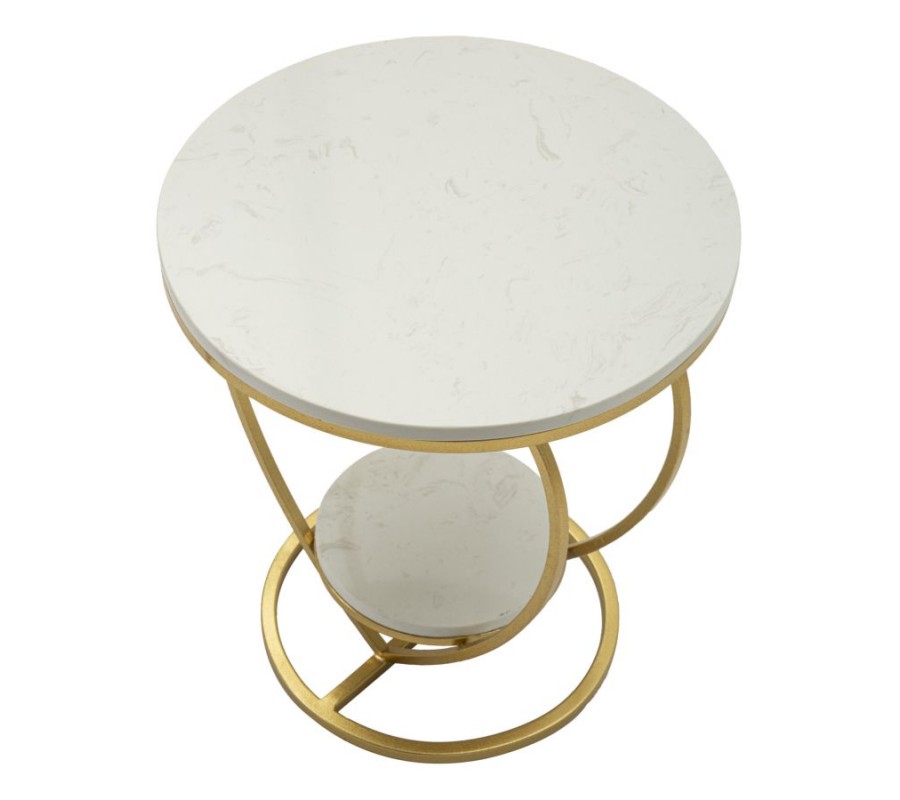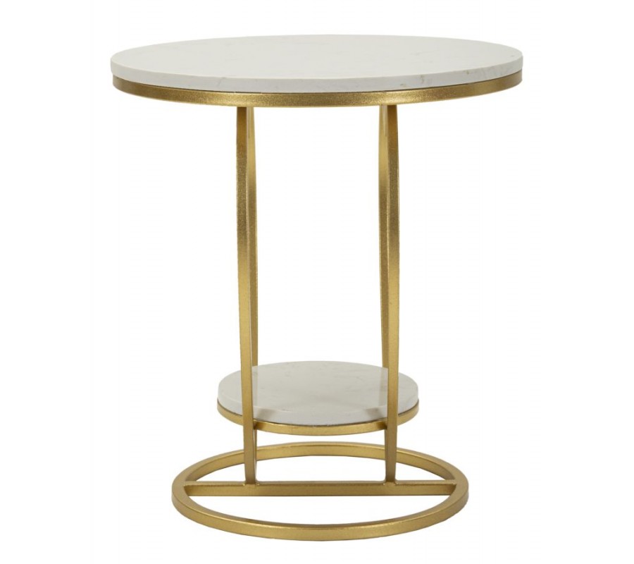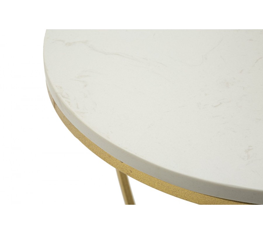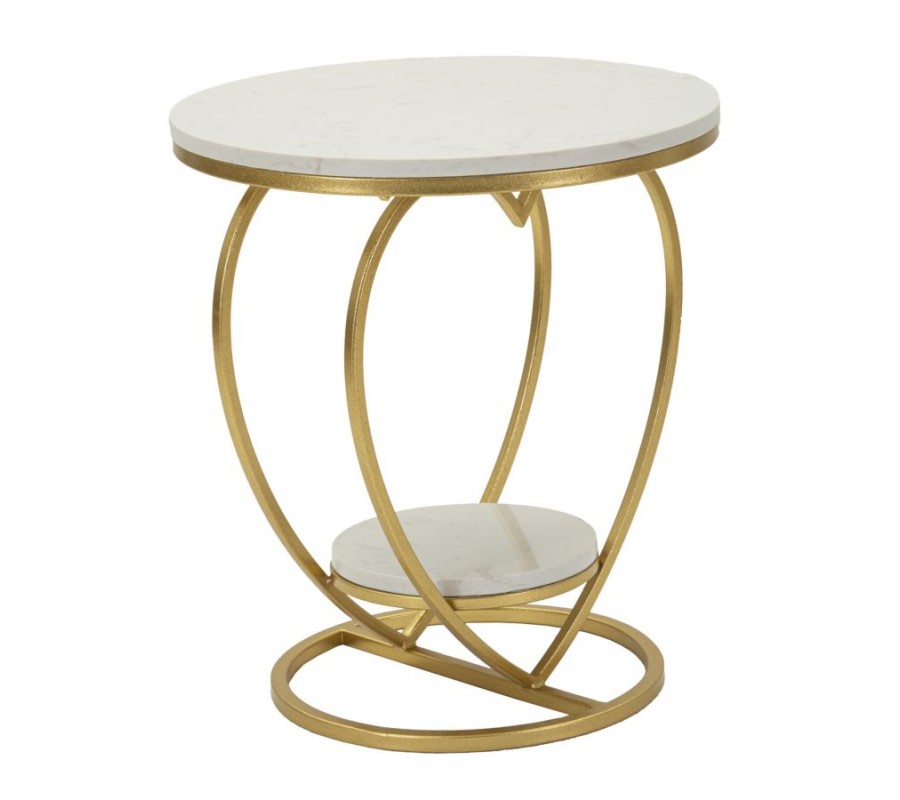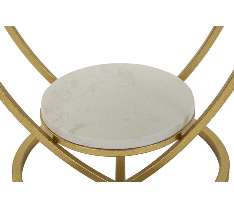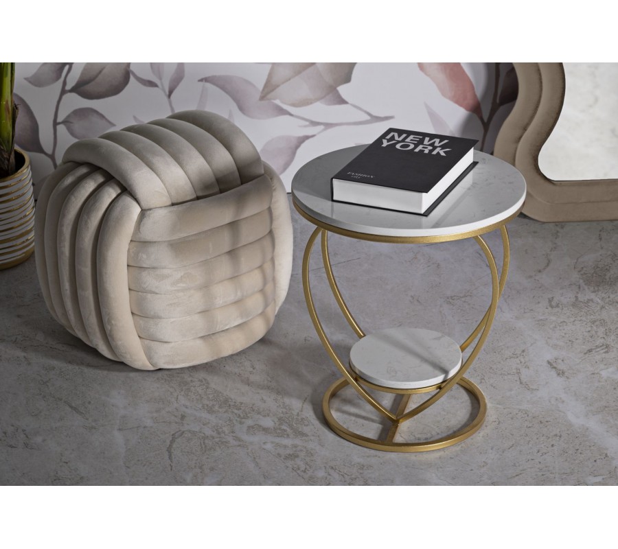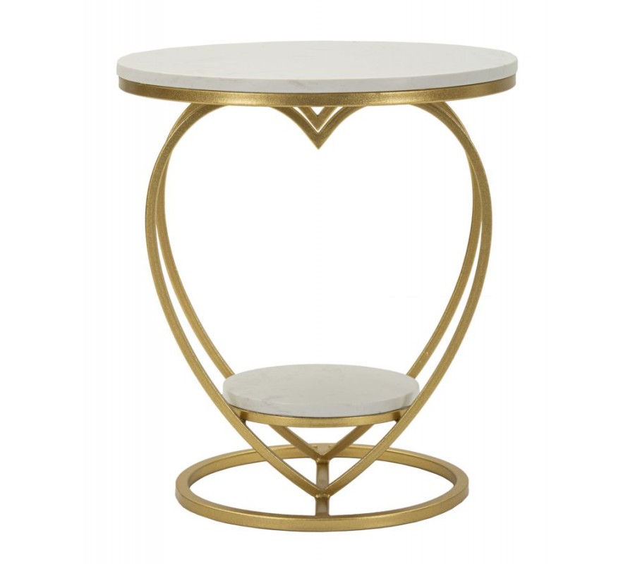 Príručný stolík Amorattia zaujme originálnym a romantickým dizajnom v tvare srdca, ktorý zároveň pôsobí nadčasovo a elegantne. Konštrukcia je vyrobená z kovu so zlatým povrchom, vďaka čomu pôsobí luxusne a stabilne zároveň. Vrchnú aj spodnú okrúhlu dosku tvorí biely mramor, ktorý je doplnený o jemné sivé žilky – každý kus je tak originálny.