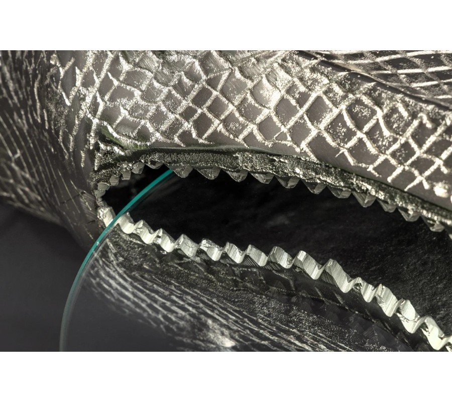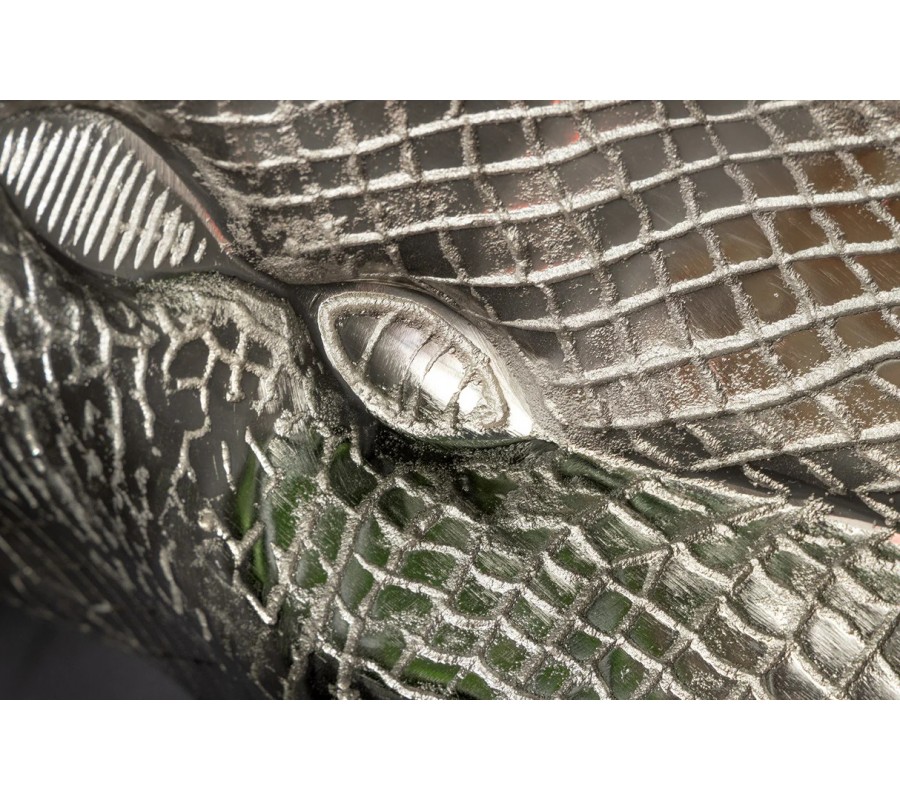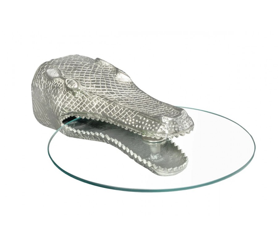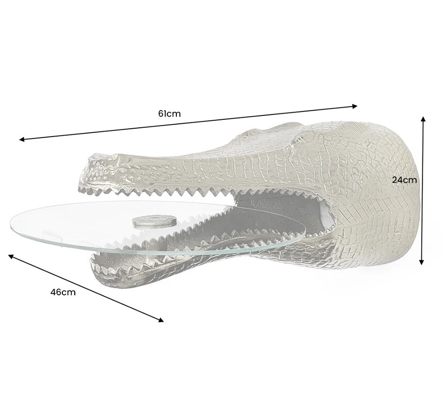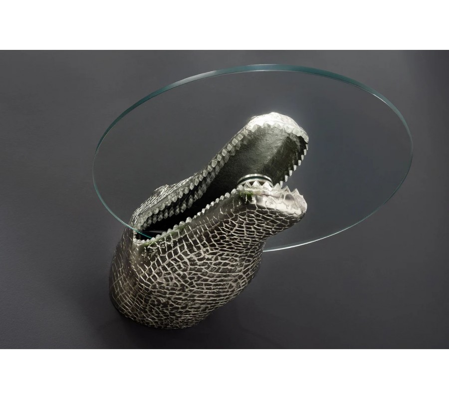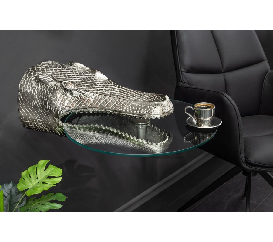 Príručný stolík Crocodile zaujme na prvý pohľad svojím výnimočným dizajnom, ktorý spája glamourové a art deco prvky. Okrúhla sklenená doska z tvrdeného bezpečnostného skla je elegantne položená na dramatickom podstavci v tvare otvorenej krokodílej papule, vyrobenej z kovu v lesklej striebornej farbe.