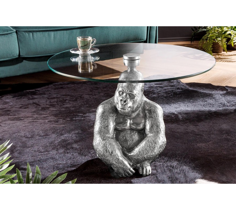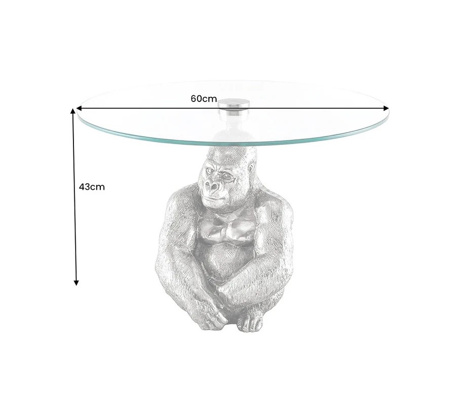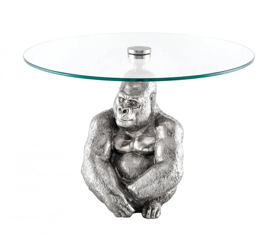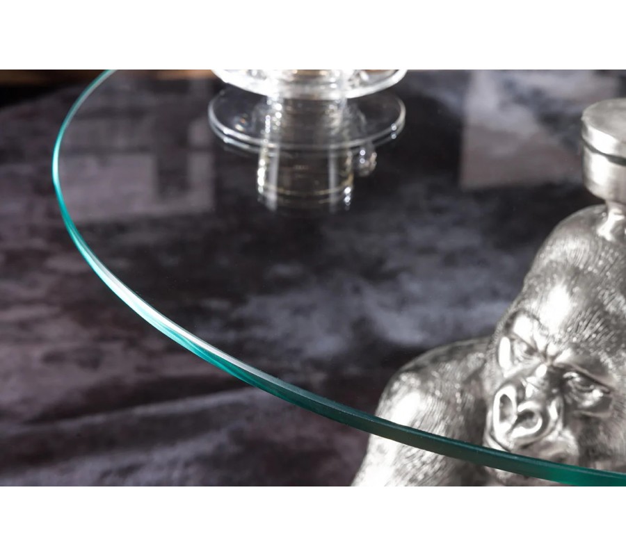 Art deco okrúhly príručný stolík Tierra Glam so striebornou kovovou podstavou v podobe gorily a sklenenou doskou 60 cm