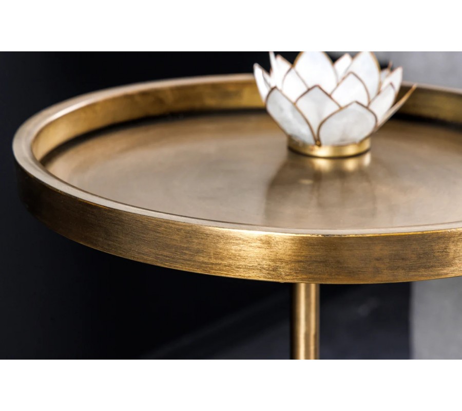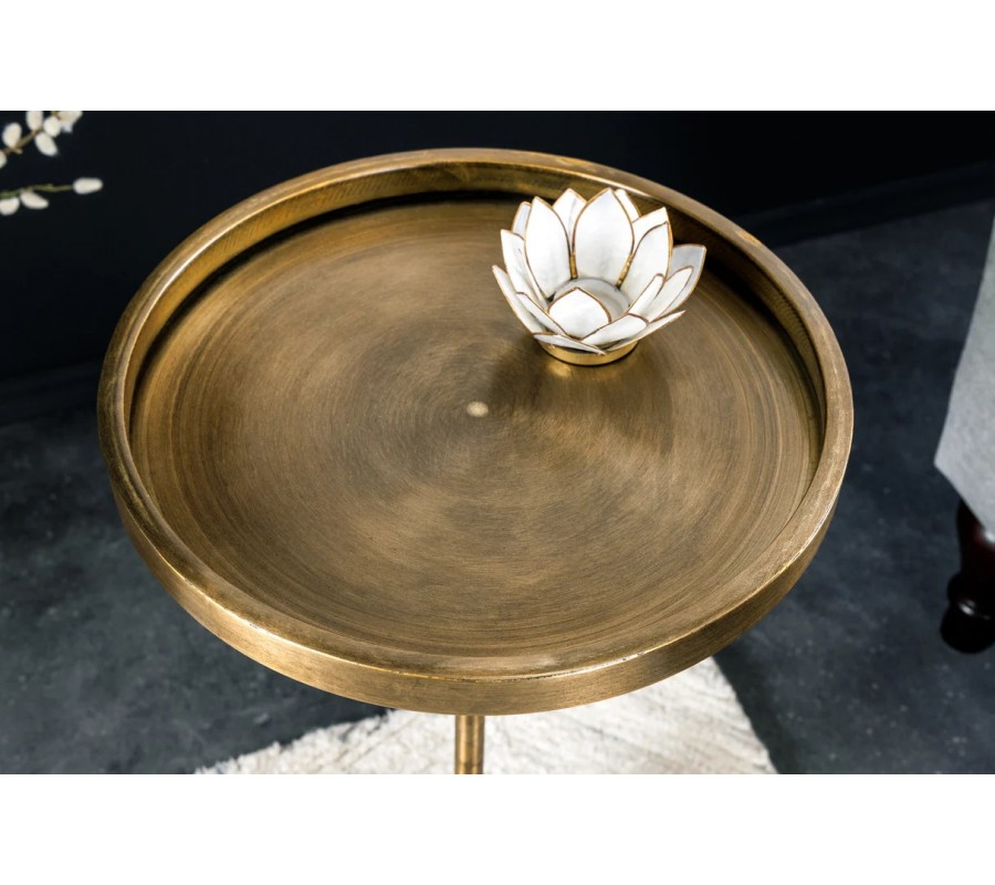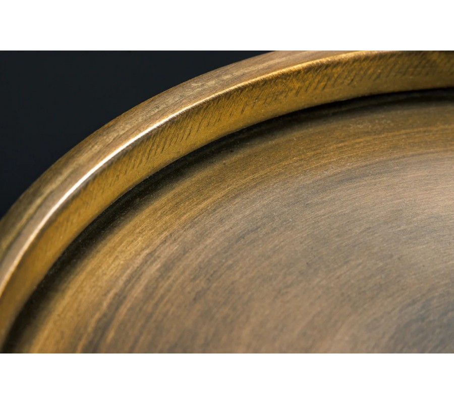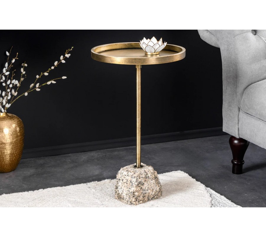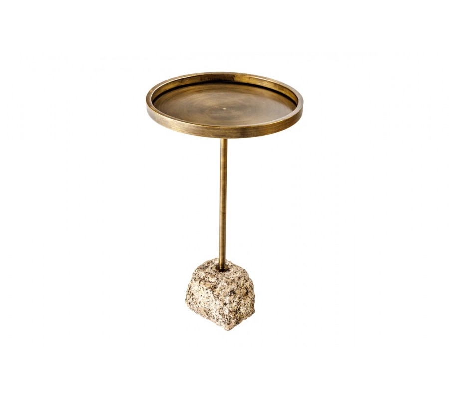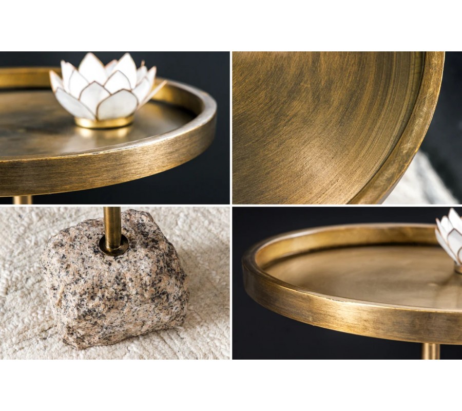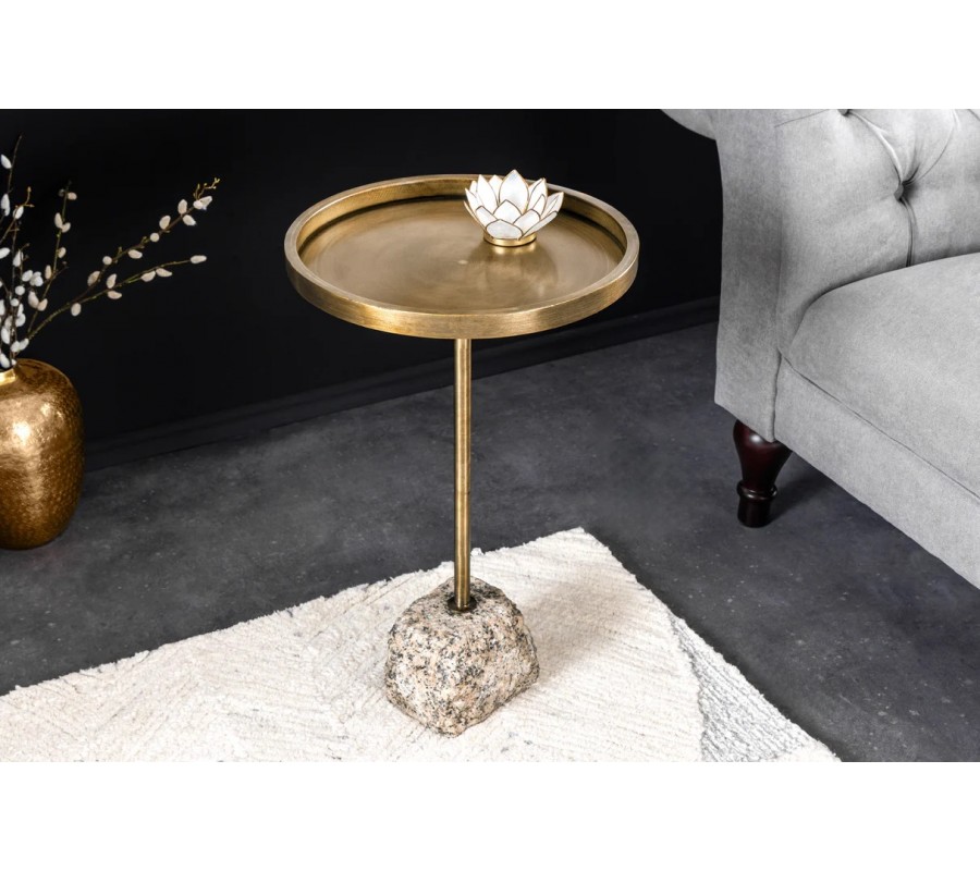 Príručný stolík Stone vyniká výrazným kontrastom medzi surovým vzhľadom prírodného kameňa a elegantným kovovým povrchom v zlatej patinovanej úprave. Jeho okrúhla doska má decentne vyvýšený okraj, čo dodáva praktickosť aj dekoratívny charakter.