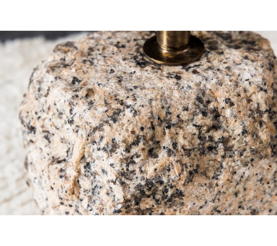 Podstava je tvorená asymetrickým kusom mramoru v krémovej farbe s výraznými tmavými bodkami, ktorý pripomína neopracovaný prírodný kameň. Zabezpečuje skvelú stabilitu. Do tohto základu je ukotvená štíhla kovová tyč, ktorá nesie hornú dosku. Každý kus je jedinečný vďaka ručnému spracovaniu a originálnej kamennej štruktúre.