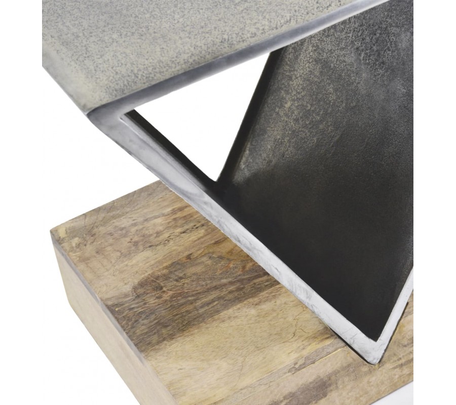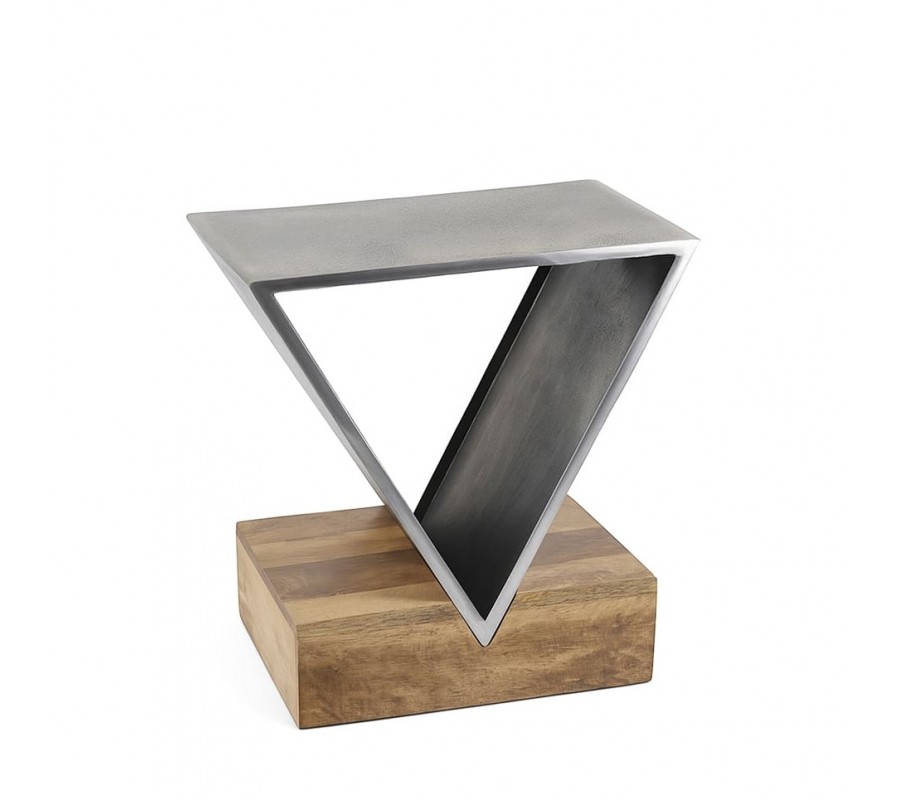 V strede drevenej podstavy sa nachádza výrez v tvare V, v ktorom je upevnená vrchná konštrukcia vyrobená z kovových plátov. Povrch má sivú farbu s jemnou svetlejšou patinou, ktorá zdôrazňuje industriálny štýl. Trojuholníkový prvok je orientovaný vrcholom dole a jeho základňa slúži ako vrchná doska stolíka. Voľný priestor v strede konštrukcie vizuálne dizajn odľahčuje a môžete ho využiť napríklad na odkladanie časopisov či rozčítanej knihy.