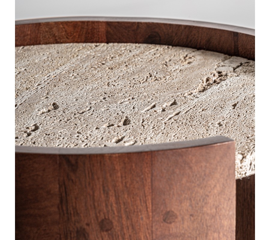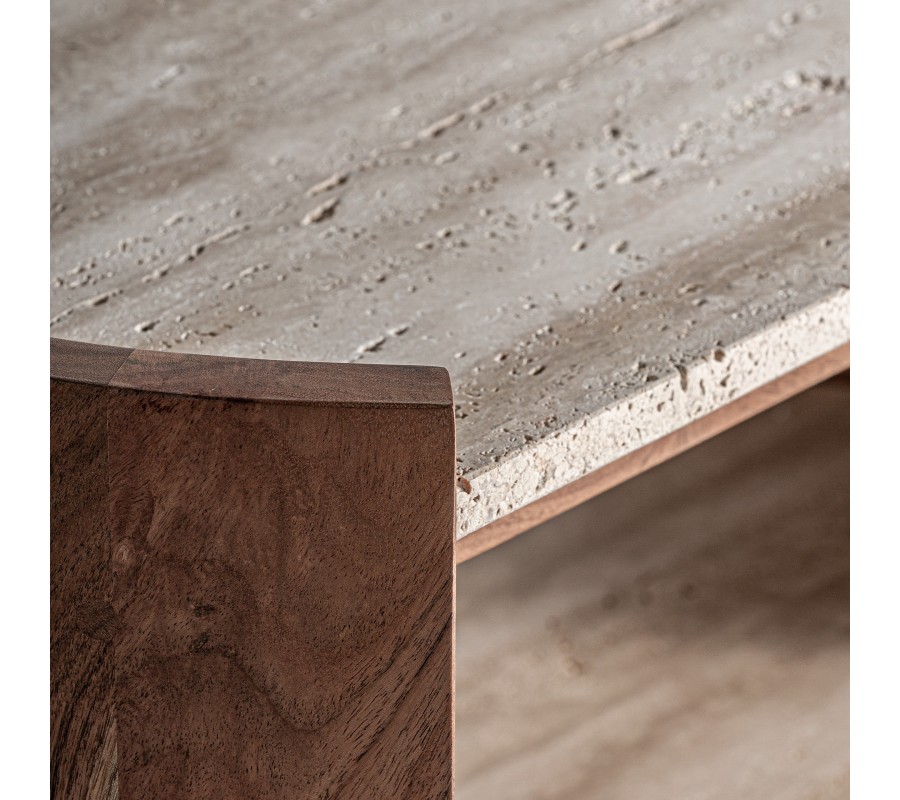 Dominantným prvkom je vrchná doska z béžového travertínu, kameňa, ktorý sa vyznačuje jemnou pórovitosťou a unikátnou štruktúrou, pričom každý kus je originál. Pod ňou sa nachádza druhá travertínová polička, ktorá zvyšuje funkčnosť stolíka a zároveň vytvára elegantný dvojúrovňový efekt. Obe kamenné dosky sú pevne vsadené do subtílnej, ale stabilnej drevenej výstuže, ktorá je skrytá pod ich hranou a zaisťuje ich bezpečné uchytenie.