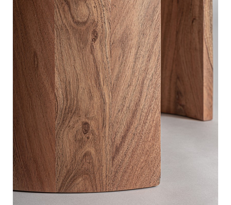 Konštrukciu tvoria dve masívne, jemne zaoblené bočné nožičky z kvalitného mangového dreva, tvarované do poloblúka. Ich krásna prírodná kresba s tmavohnedými odtieňmi a hladkou povrchovou úpravou zvýrazňuje ručné spracovanie a luxusný charakter celku. Kombinácia teplého dreva a chladného kameňa pôsobí kontrastne, no zároveň vyvážene a nadčasovo.