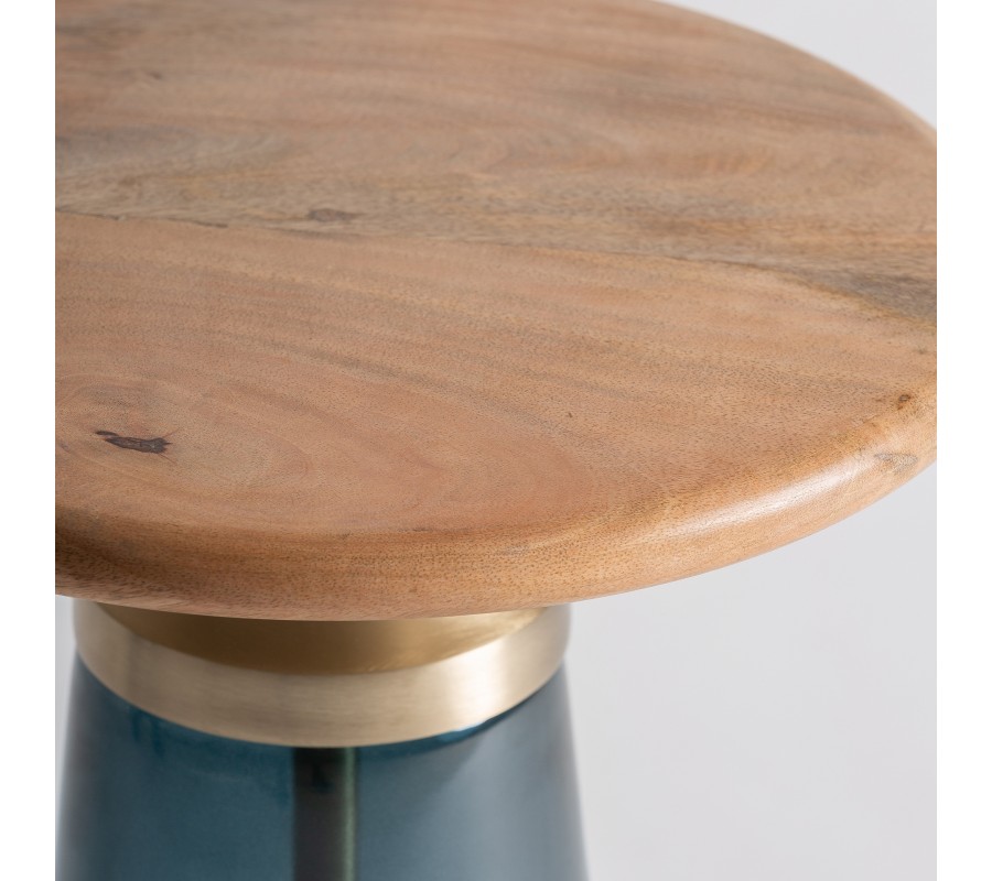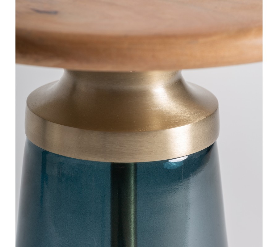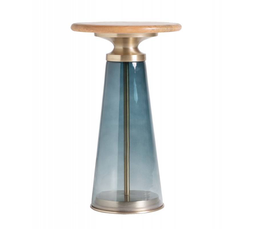 Luxusný glamour sklenený okrúhly príručný stolík Asuris s drevenou vrchnou doskou a modrou priehľadnou podstavou 52 cm
