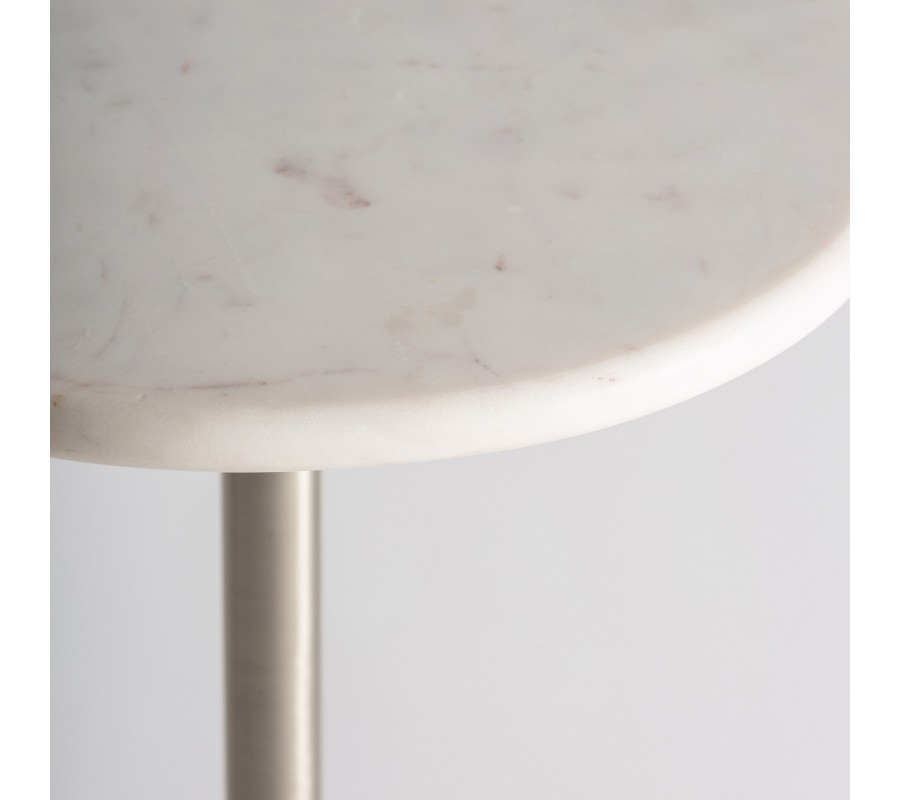 Okrúhla vrchná doska je vyrobená z bieleho mramoru s jemným bledoružovým žilkovaním, ktoré dodáva povrchu nádych elegancie. Doska pôsobí luxusne a zároveň je mimoriadne jednoduchá na údržbu.