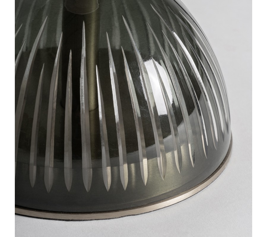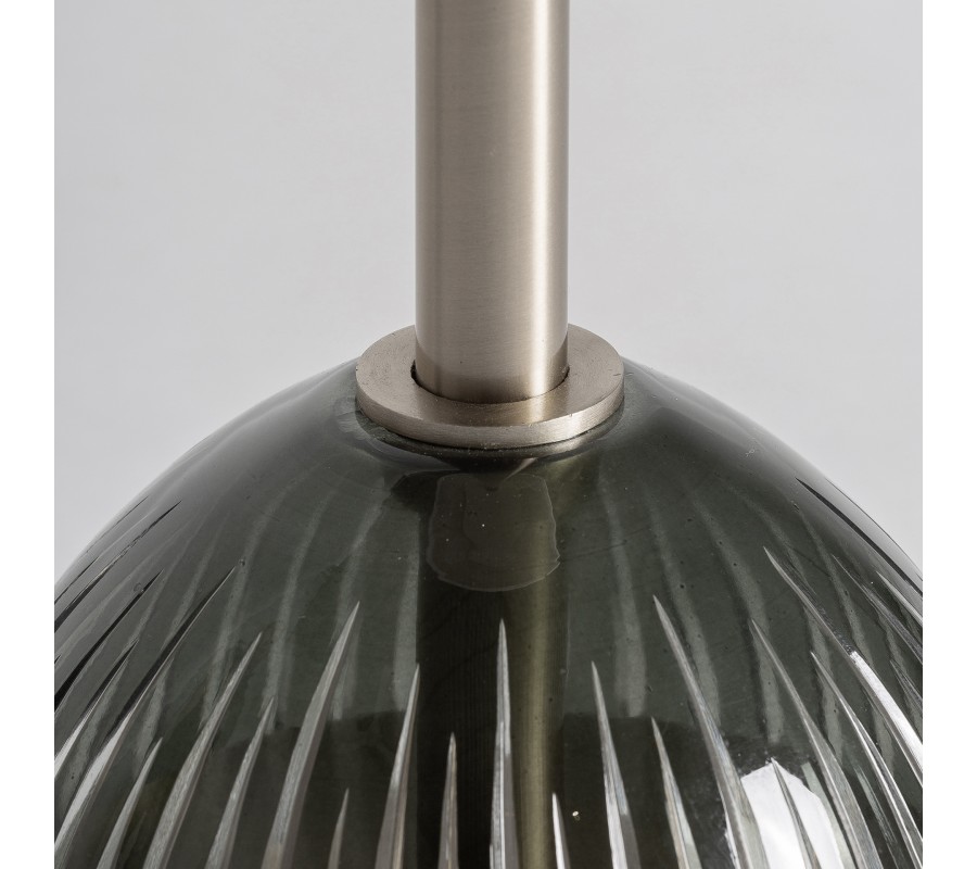 Stolík je uložený na jednej podstave tvaru pologule, ktorá je vyrobená zo skla v priesvitnej tlmenej zelenej farbe. Povrch nohy zdobí zvislé dekoratívne drážkovanie, ktoré vytvára jemný svetelný efekt a dodáva stolíku vizuálnu hĺbku. Sklo má lesklý povrch, vďaka čomu pôsobí luxusne a harmonicky ladí s kovom. Spodná časť nohy je zakončená tenkým strieborným kovovým podkladom, ktorý zároveň slúži ako ochrana pred opotrebovaním.