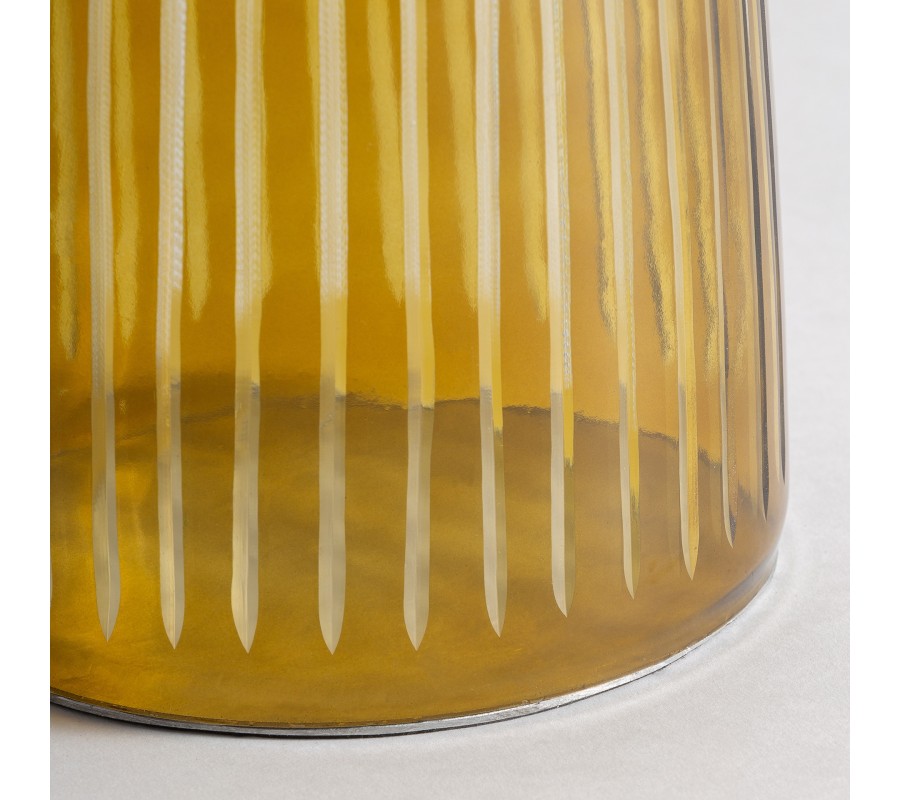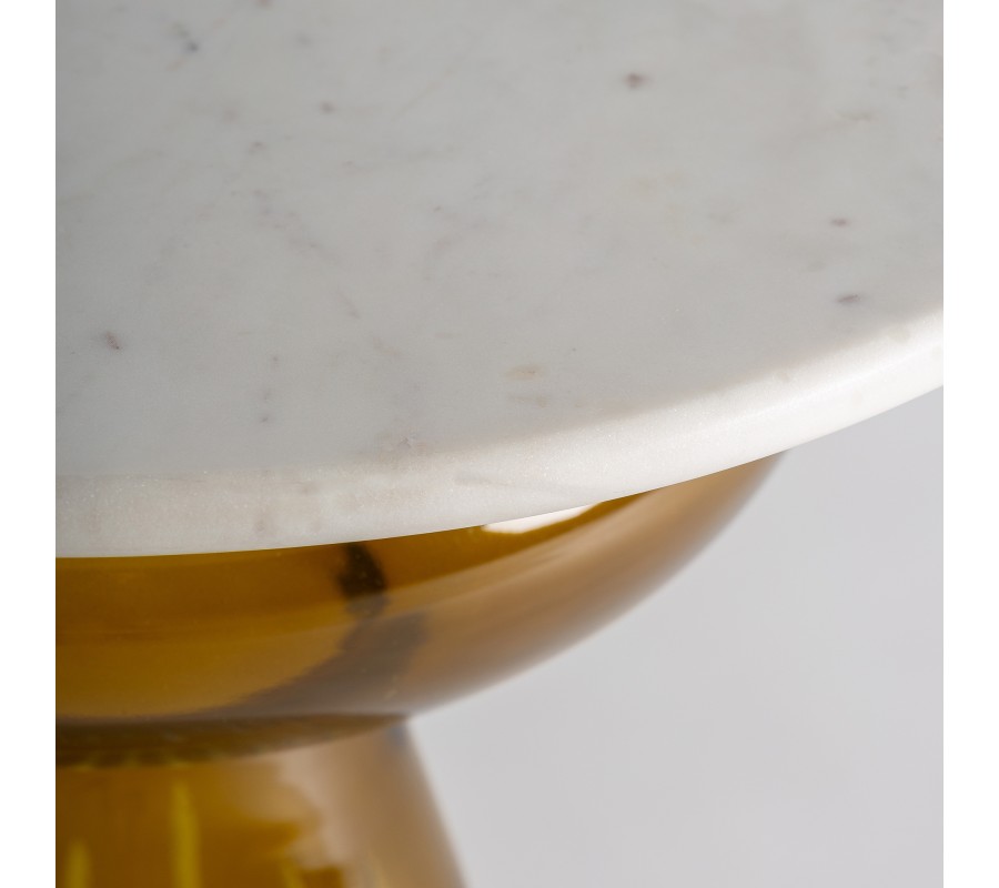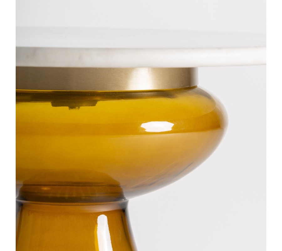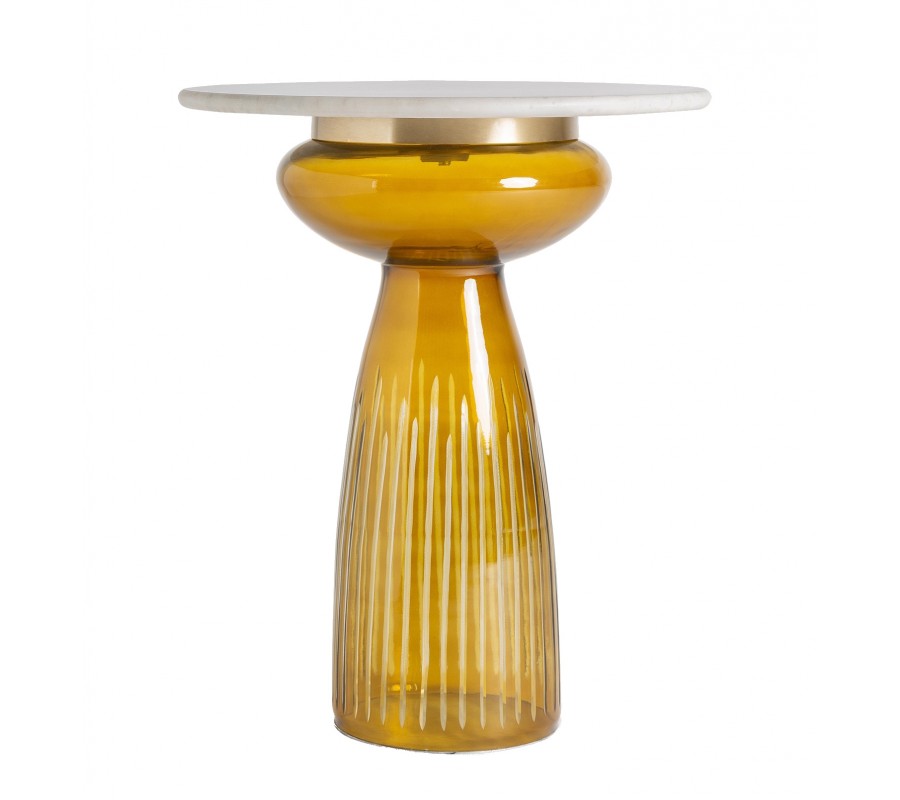 Stolík stojí na jednej nohe vyrobenej z tónovaného skla v teplej žltej farbe. Má zaujímavý tvar, ktorý pripomína zaoblený kužeľ s rozšíreným vrchom s výrazným zaoblením. Sklenený povrch je lesklý, jemne priesvitný a dekorovaný zvislými reliéfnymi drážkami, ktoré vytvárajú optickú hĺbku a tvoria originálny detail.
