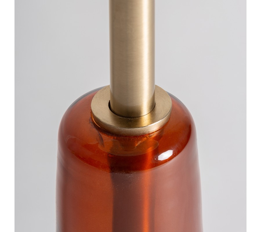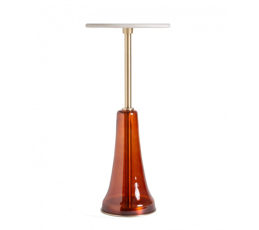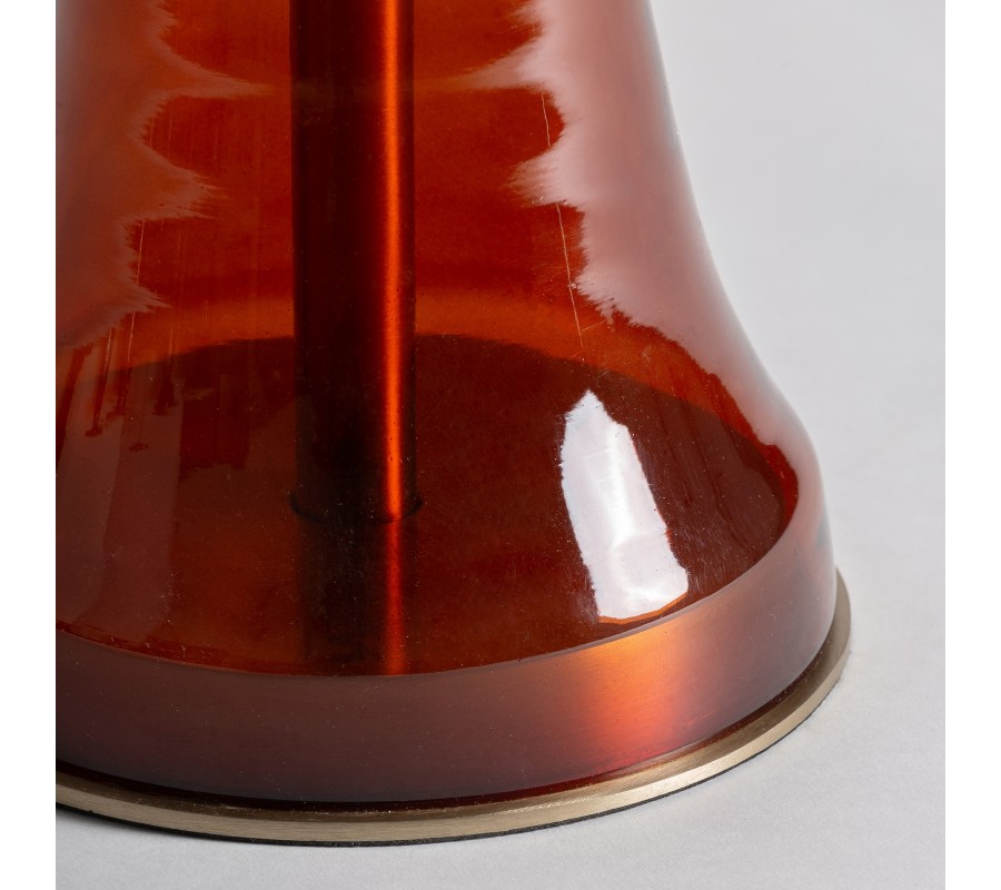 Stolík stojí na jednej nohe rozširujúcej sa smerom nadol do tvaru zaobleného kužeľa. Noha je vyrobená zo skla v jemne priesvitnej červenej farbe s lesklou povrchovou úpravou, vďaka čomu vytvára pôsobivý svetelný efekt a teplý odlesk. Na spodnej časti sa nachádza tenký zlatý kovový podklad, ktorý dotvára celkový dizajn a zároveň chráni spodnú hranu pred poškodením.