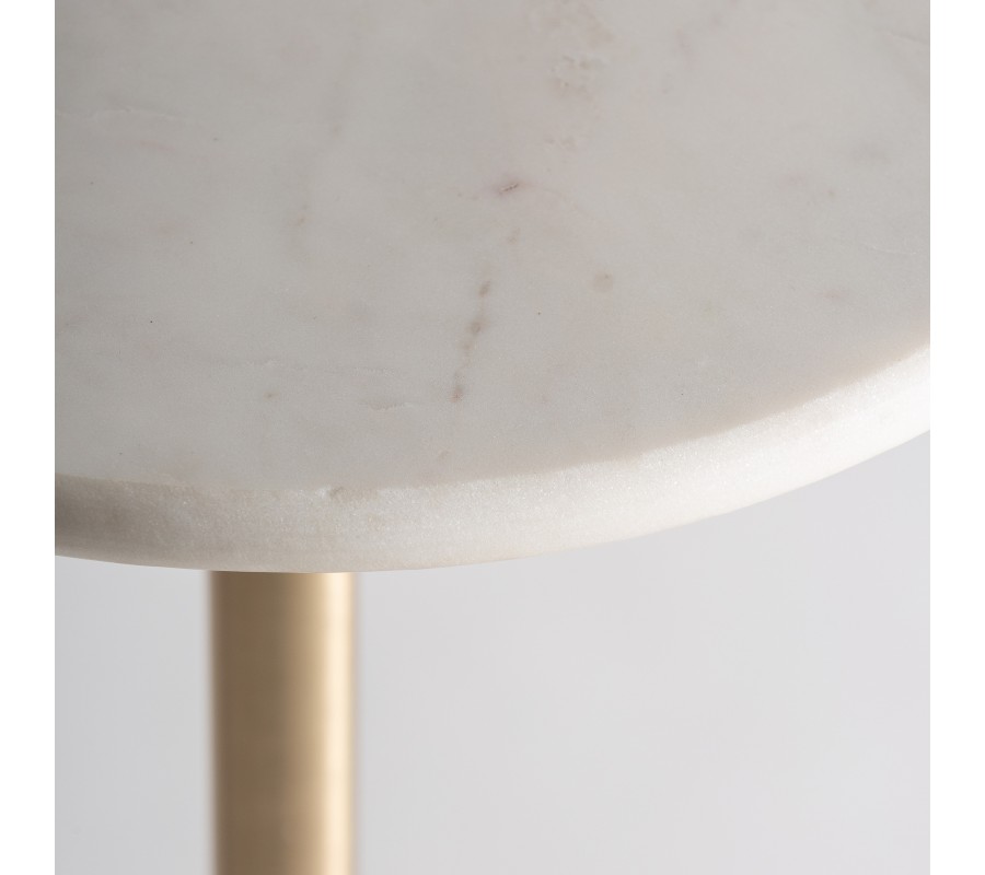 Zlatá kovová konštrukcia prepája mramorovú dosku s nohou stolíka pomocou tenkej vertikálnej tyče, ktorá pôsobí subtílne a zároveň zabezpečuje maximálnu stabilitu. Jej lesklý povrch podčiarkuje jeho glamour charakter a dodáva mu elegantný vzhľad.