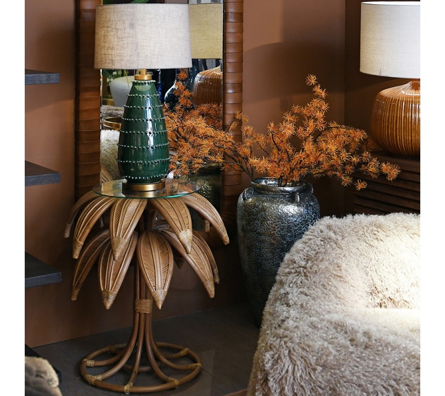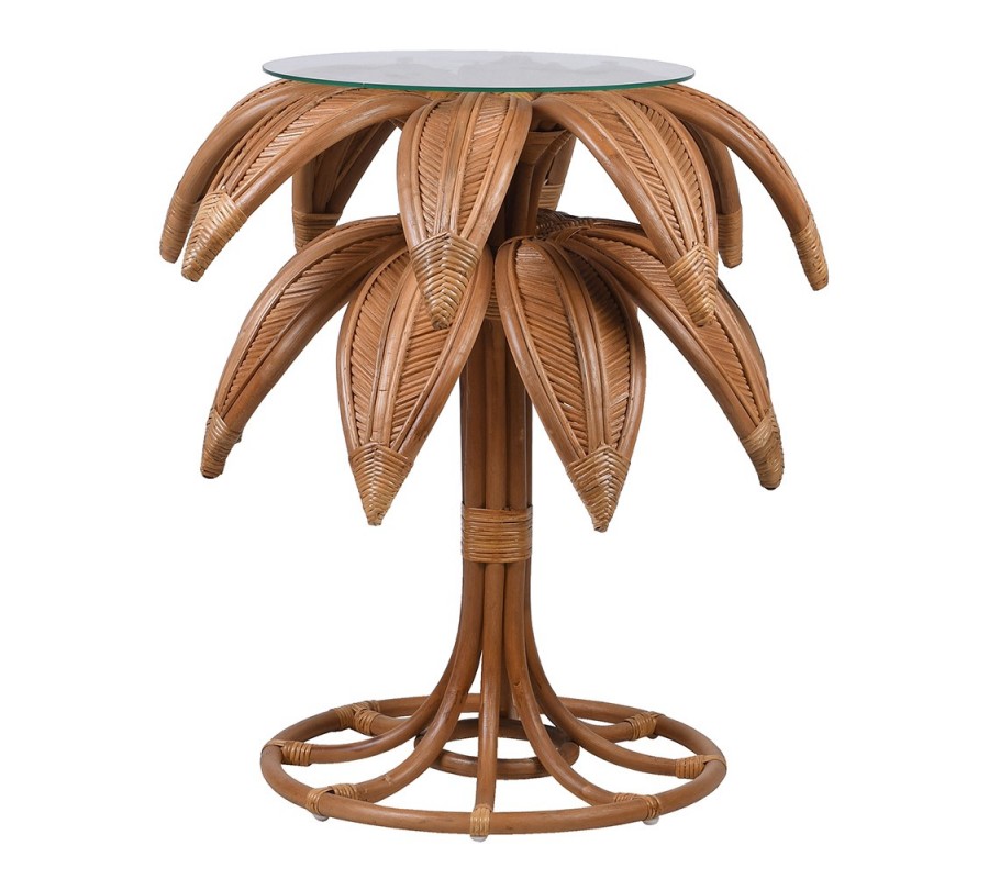Príručný stolík Palma je originálnym etno doplnkom, ktorý prinesie do interiéru kúsok exotickej prírody. Celý je vyrobený z prírodného ratanu v hnedom odtieni, pričom jeho unikátna konštrukcia napodobňuje tvar palmy s dvomi poschodiami listov. Precízne vypletené ratanové listy dodávajú stolíku sochársky charakter a pôsobia ako výrazný dekoračný prvok.