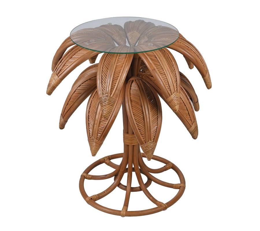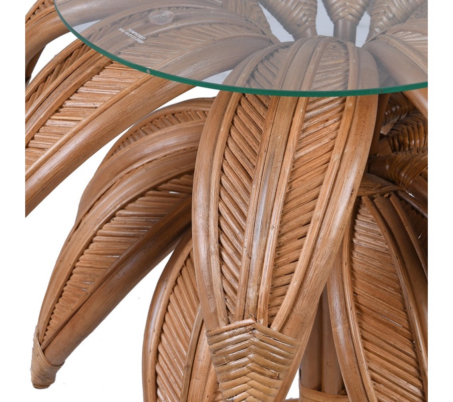 Etno ratanový okrúhly príručný stolík Palma s hnedou konštrukciou v tvare listov a sklenenou doskou 77 cm