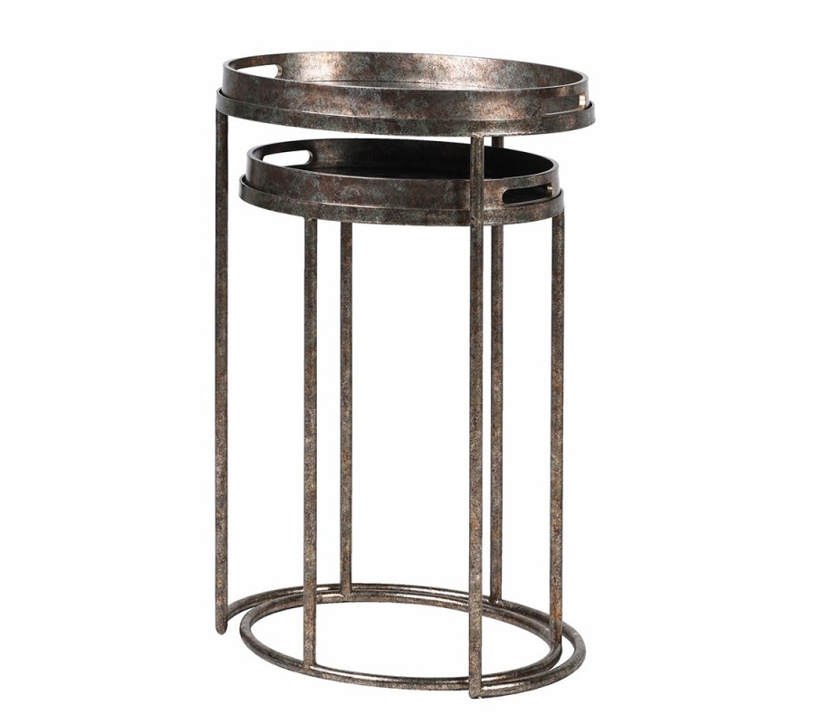Sada dvoch príručných stolíkov Rust je originálnym doplnkom v industriálnom štýle, ktorý vyniká svojou kombináciou surového kovového vzhľadu a jemného umeleckého detailu. Konštrukcia je vyrobená z kovu v striebornej farbe s hrdzavou patinou, čo stolíkom dodáva autentický industriálny charakter.