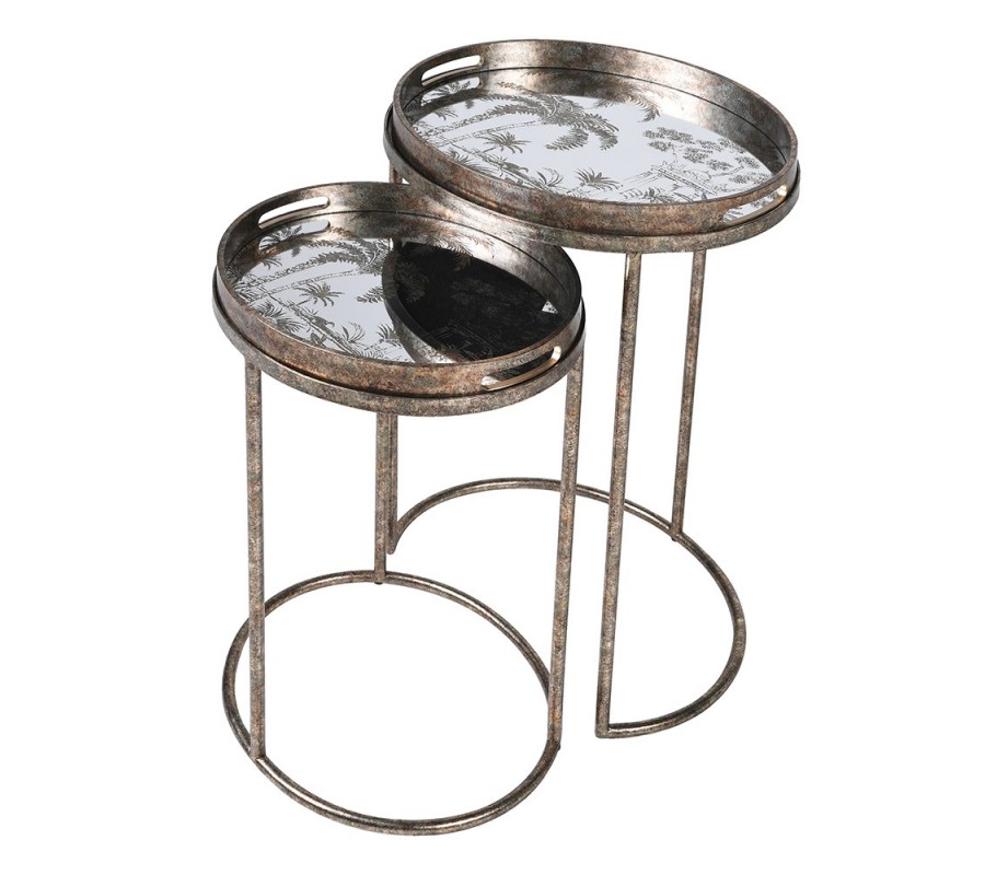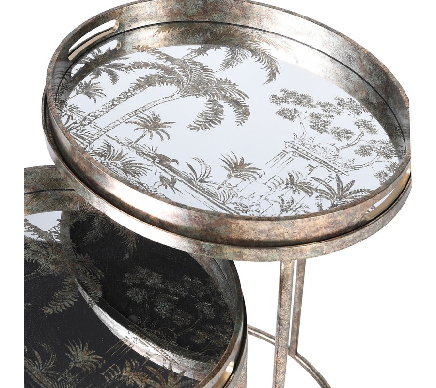 Industriálna sada oválnych kovových príručných stolíkov Rust so striebornou patinou a zrkadlovou doskou s motívom paliem 67 cm