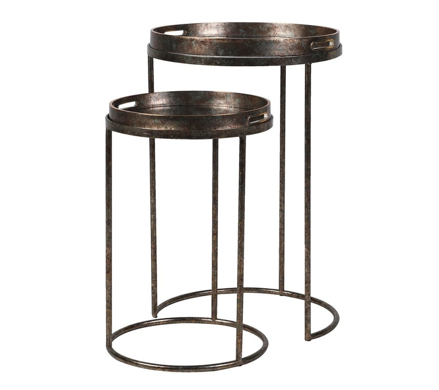 Sada dvoch príručných stolíkov Rust prináša do interiéru originálny industriálny štýl s umeleckým nádychom. Stolíky majú okrúhly tvar, sú vyrobené z kovu s bronzovým povrchom a dizajnom hrdze a ich povrch tvorí zrkadlová doska dekorovaná obrazom lastovičiek. Okolo dosky sú vyvýšené okraje s praktickými bočnými úchytkami, ktoré zvyšujú funkčnosť a zároveň dodávajú dizajnu charakteristický výraz.