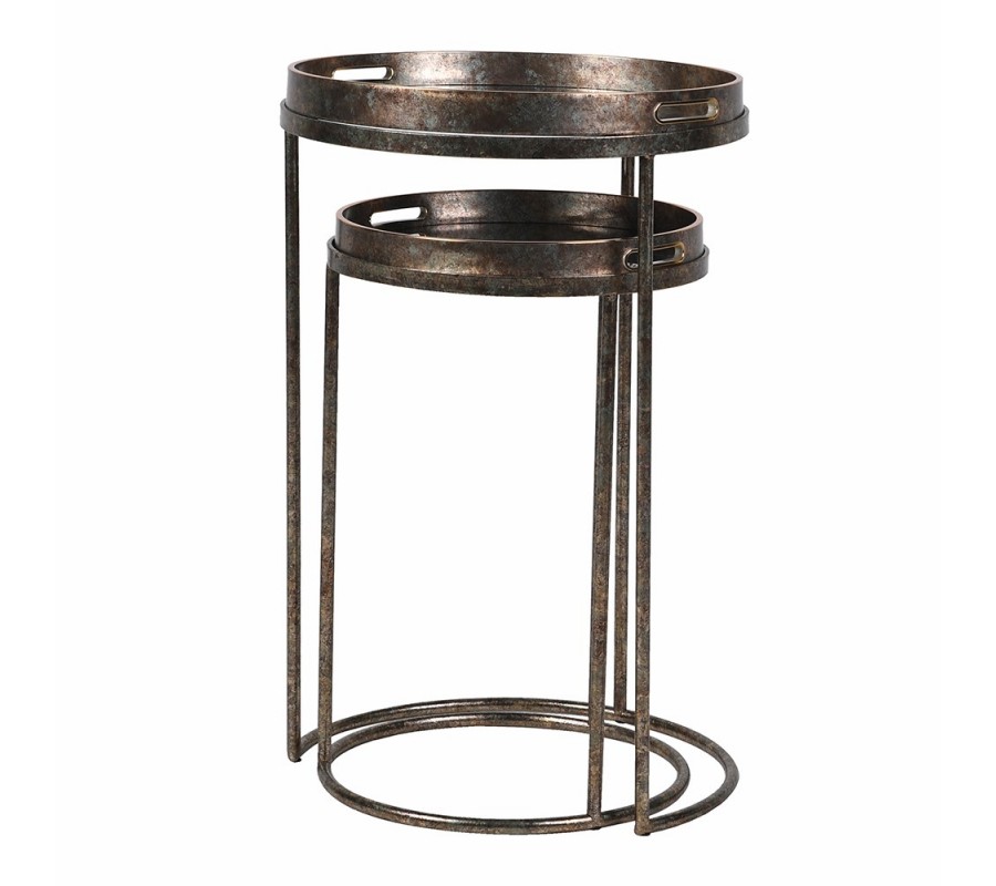 Industriálna sada dvoch okrúhlych príručných stolíkov Rust z bronzového kovu so zrkadlovou doskou a hrdzavou patinou 73 cm