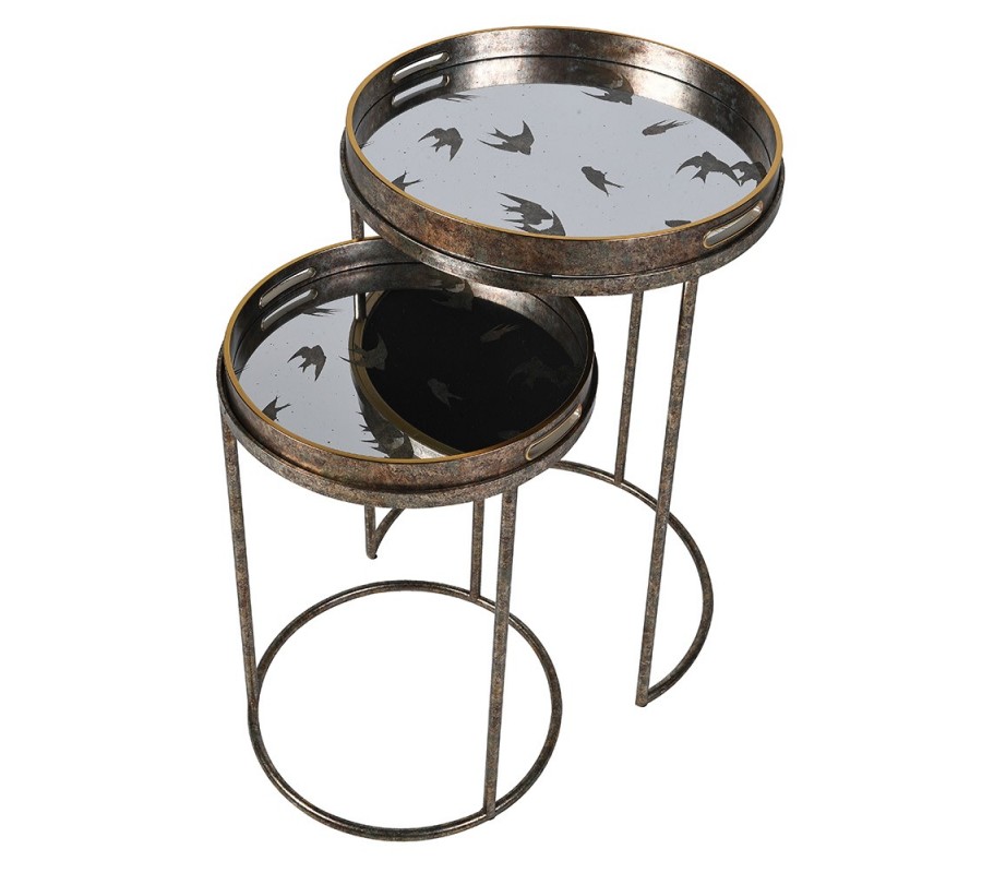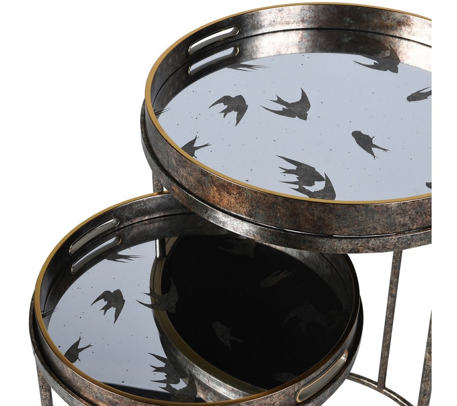 Jedinečným detailom tejto sady je kombinácia kovového rámu s patinou a zrkadlovej dosky s dekorom lastovičiek, ktorá pôsobí ako umelecký akcent. Stolíky tak nielen slúžia ako praktický odkladací priestor, ale aj ako dekoratívny prvok.