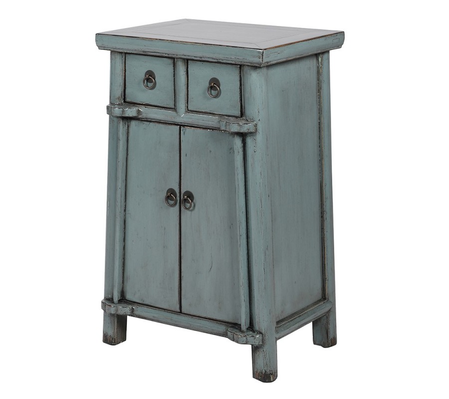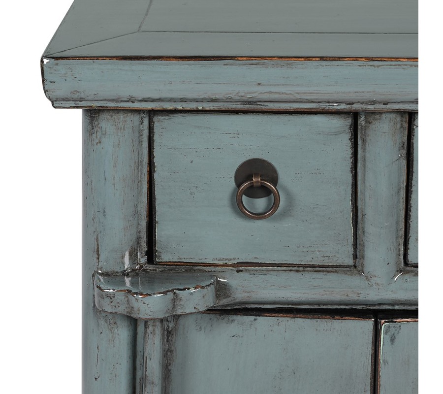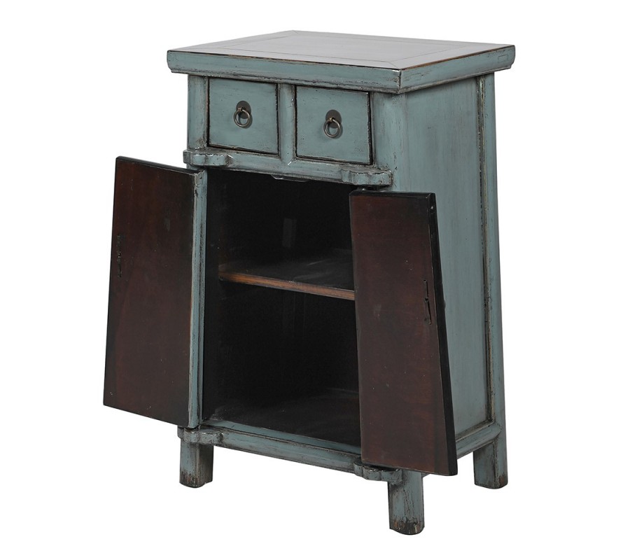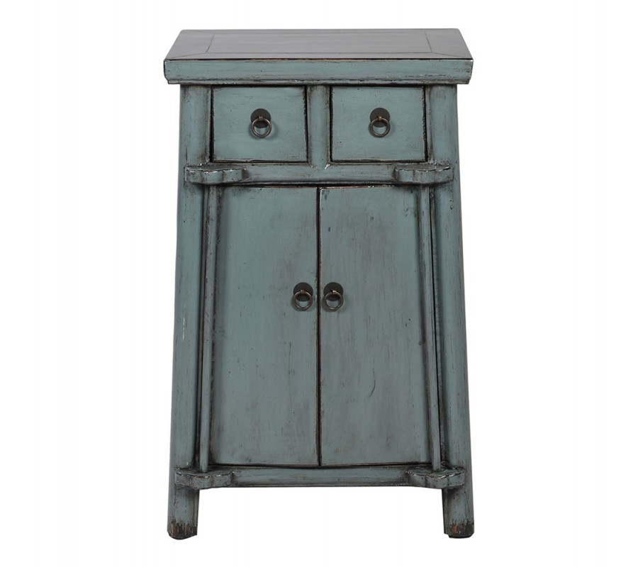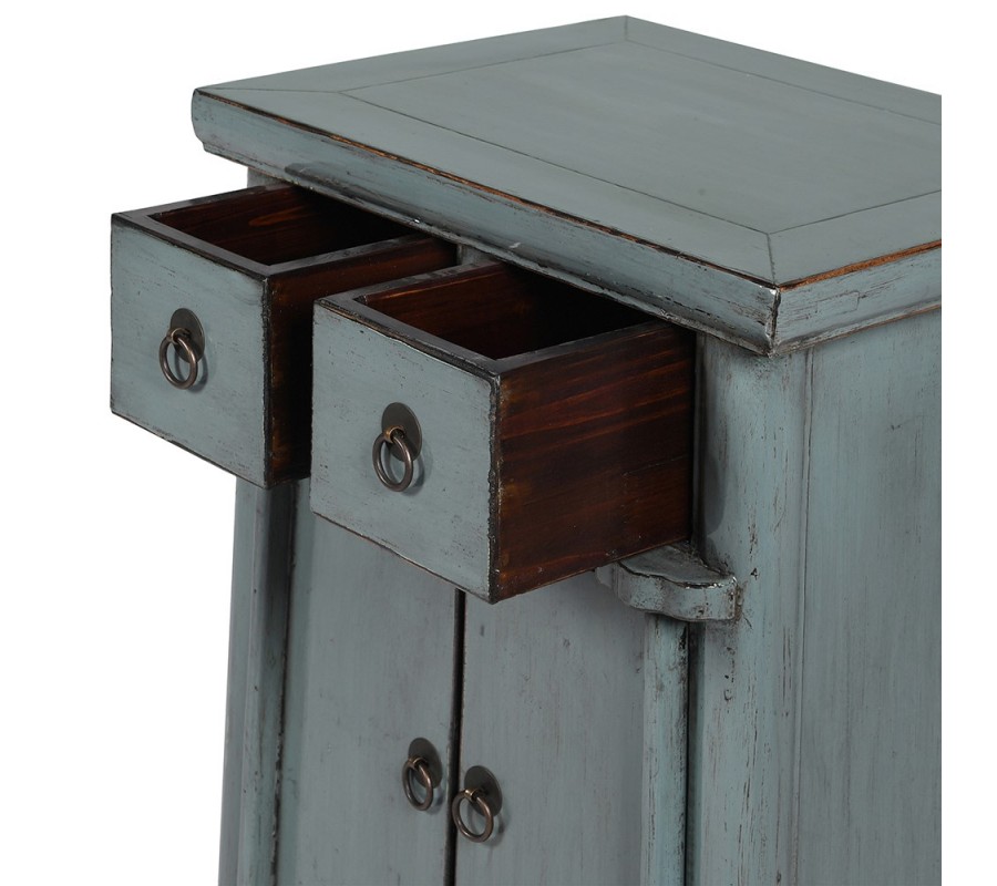 V hornej časti sa nachádzajú dve malé zásuvky s mosadznými kovovými kruhovými úchytkami, ktoré pôsobia elegantne a prakticky zároveň. Pod nimi je umiestnená dvojdverová skrinka s rovnakými úchytkami, v ktorej sa nachádza jedna polica rozdeľujúca priestor na dve úrovne. Konštrukcia stolíka sa smerom nadol mierne rozširuje, čo mu dodáva stabilitu a opticky zaujímavý tvar. Stojí na nízkych pevných nožičkách, ktoré dotvárajú jeho vintage štýl. Vnútorná časť skrinky má prirodzenú hnedú farbu dreva, čo vytvára krásny kontrast k vonkajšej modrej patine.