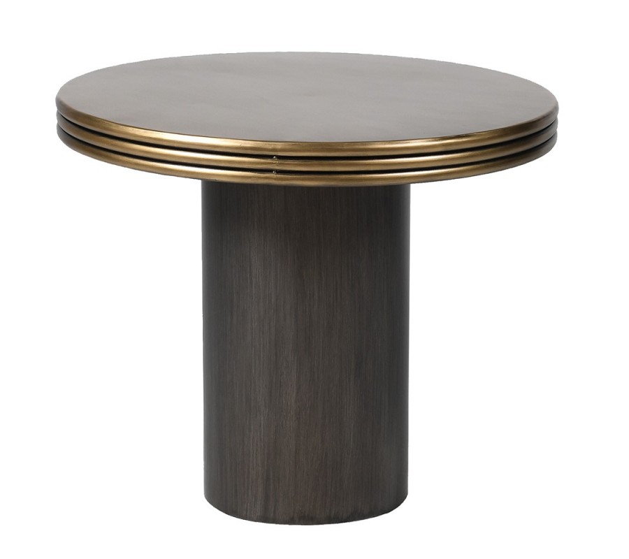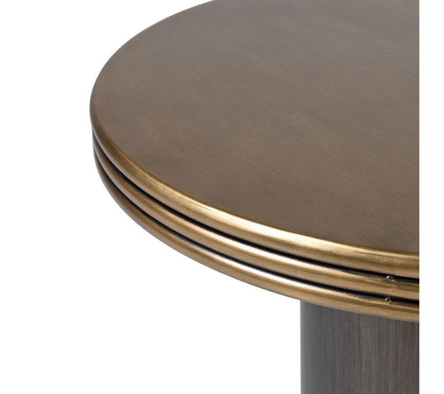 Stred vrchnej dosky má elegantnú tmavú hnedú farbu. S jej teplými tónmi sa prepája lesklé zlaté prevedenie bočnej hrany. Noha má čiernu farbu s jemnou štruktúrou pripomínajúcou letokruhy dreva. Kombinácia dvoch tmavých odtieňov pôsobí sofistikovaným dojmom, zatiaľ čo lesklý zlatý element prináša do dizajnu dotyk glamour štýlu.