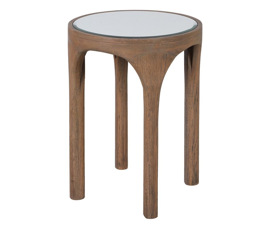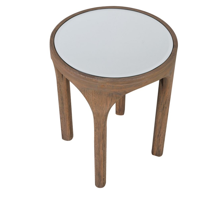 Príručný stolík Loras je elegantný doplnok v štýle art deco, ktorý spája prírodné drevo v hnedom odtieni so zrkadlovým sklom. Má okrúhly tvar, čo mu dodáva jemnosť a nadčasovú ľahkosť.