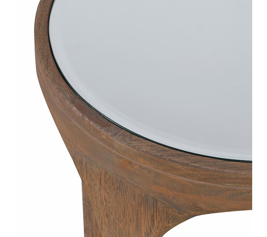 Vrchná časť stolíka je riešená zrkadlovou kruhovou sklenenou doskou, ktorá nielen pôsobí elegantne, ale aj chráni drevený povrch pred nečistotami, rozliatymi tekutinami či pred poškriabaním. Vďaka tomu zostáva stolík dlhodobo esteticky zachovalý a praktický na každodenné používanie.