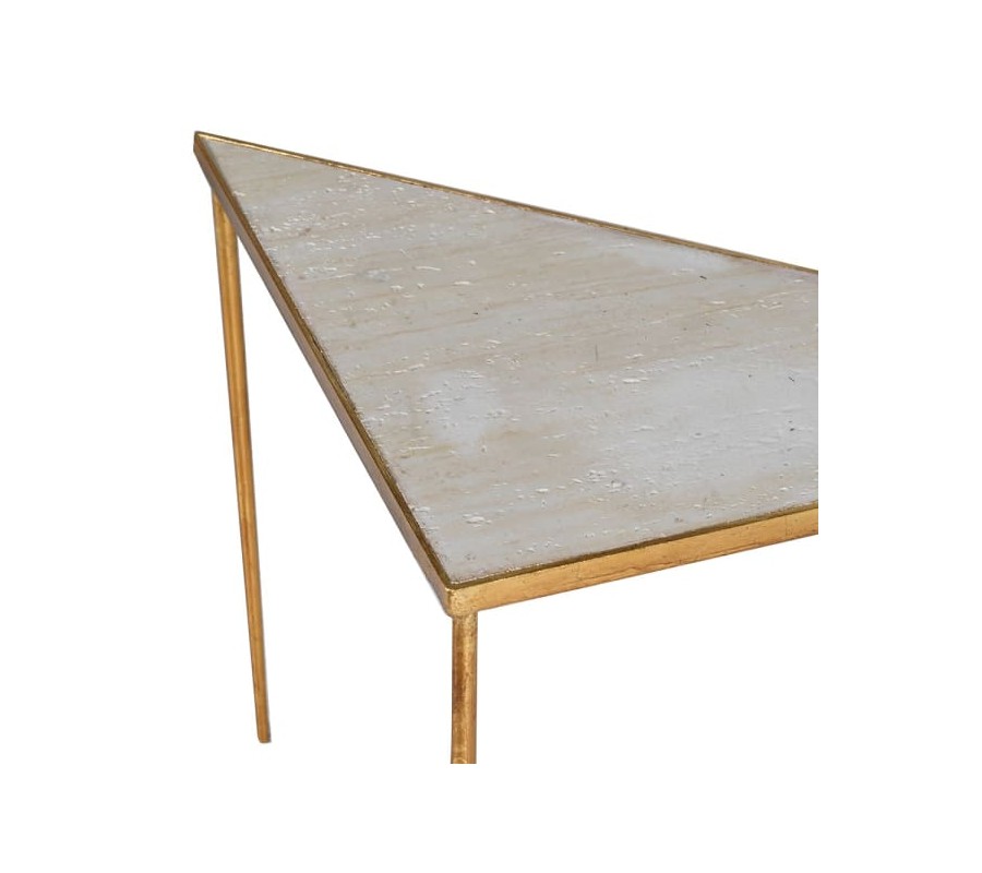 Glamour trojuholníkový príručný stolík Trinis v art deco štýle prináša do interiéru originálny dizajn a luxusný nádych. Vrchná doska je vyrobená z brezového dreva s bielou patinou, ktorá jej dodáva jemný a elegantný vzhľad. Po bokoch je doplnená zlatým kovovým rámom, ktorý ladí s konštrukciou nožičiek.