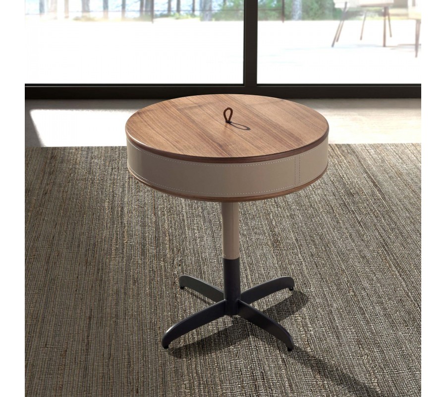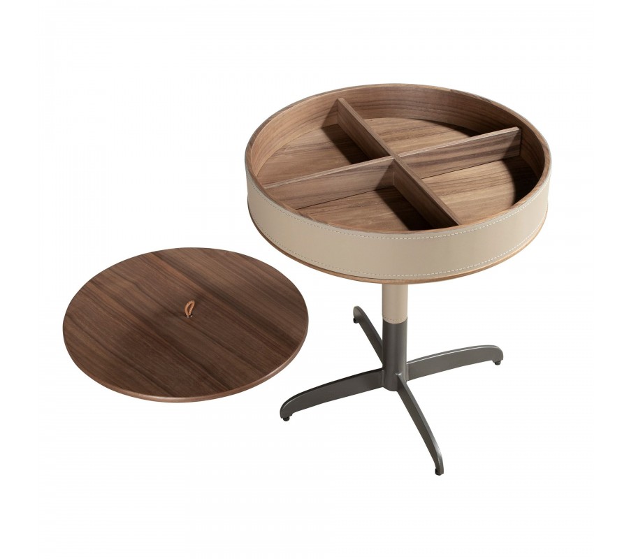 Luxusný moderný okrúhly príručný stolík Vita Naturale je jedinečným dizajnovým kúskom, ktorý spája prírodné materiály, sofistikované detaily a praktickú funkčnosť. Jeho vrchná časť je vyrobená z prírodnej orechovej dyhy, ktorá dodáva interiéru teplý a útulný nádych. Drevený poklop je vybavený malou úchytkou z pletenej hovädzej kože v hnedej farbe, ktorá pôsobí originálne a štýlovo. Pod vrchnou doskou sa ukrýva praktický úložný priestor so štyrmi samostatnými odnímateľnými priehradkami, ktoré sa po nadvihnutí poklopu jednoducho otvárajú a poskytujú miesto na drobnosti. Týmto spája estetiku s funkčnosťou. Stolík je ukážkovým príkladom moderného talianskeho dizajnu, ktorý spája krásu s praktickosťou.