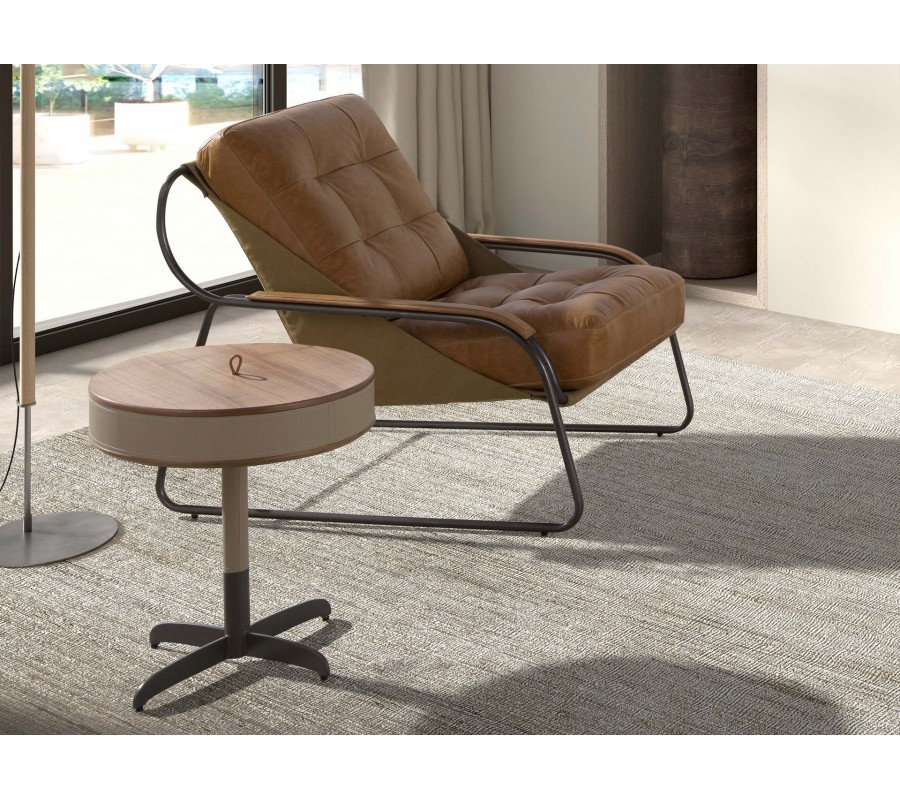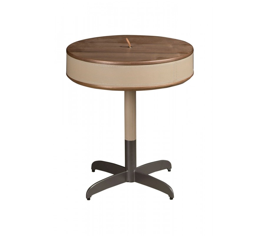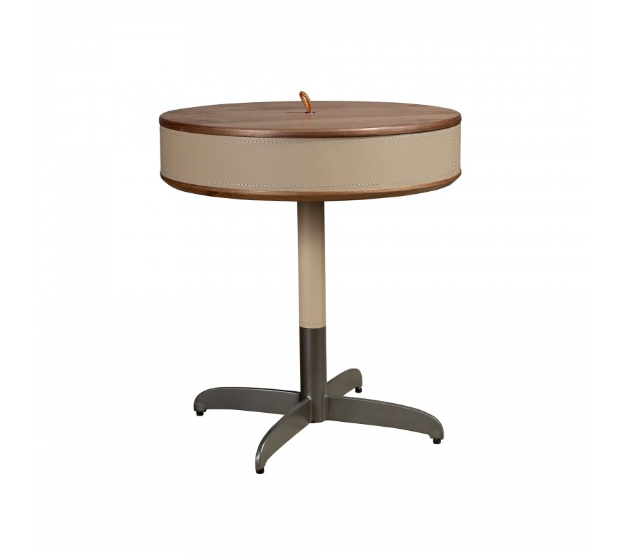 Luxusný moderný hnedý okrúhly príručný stolík Vita Naturale s koženým béžovým poťahom a úložným priestorom 50 cm