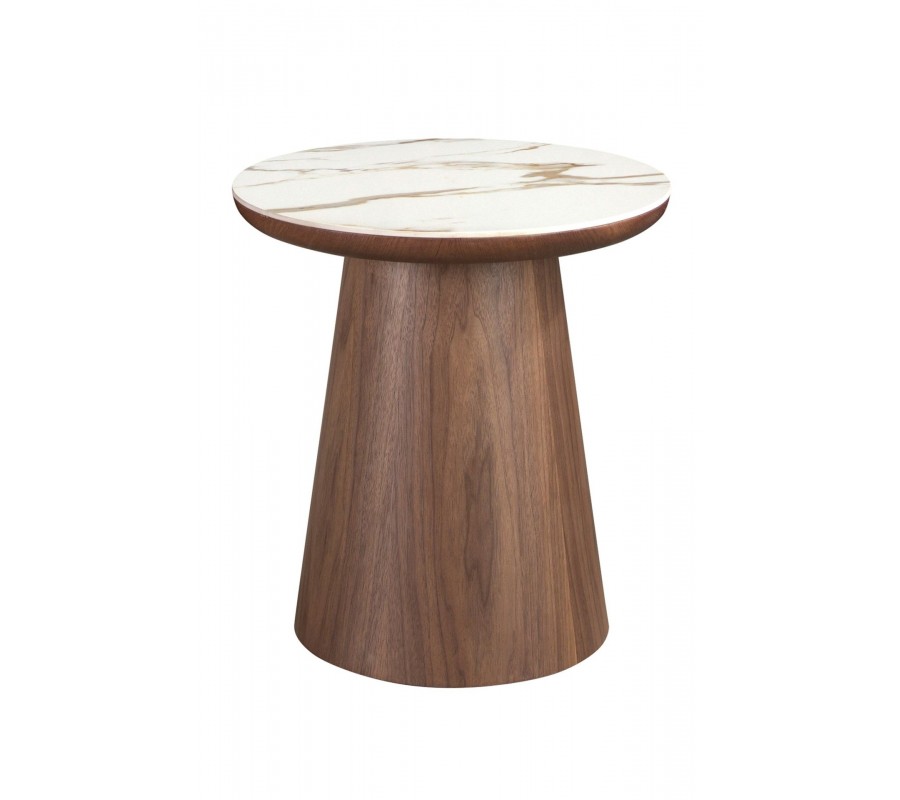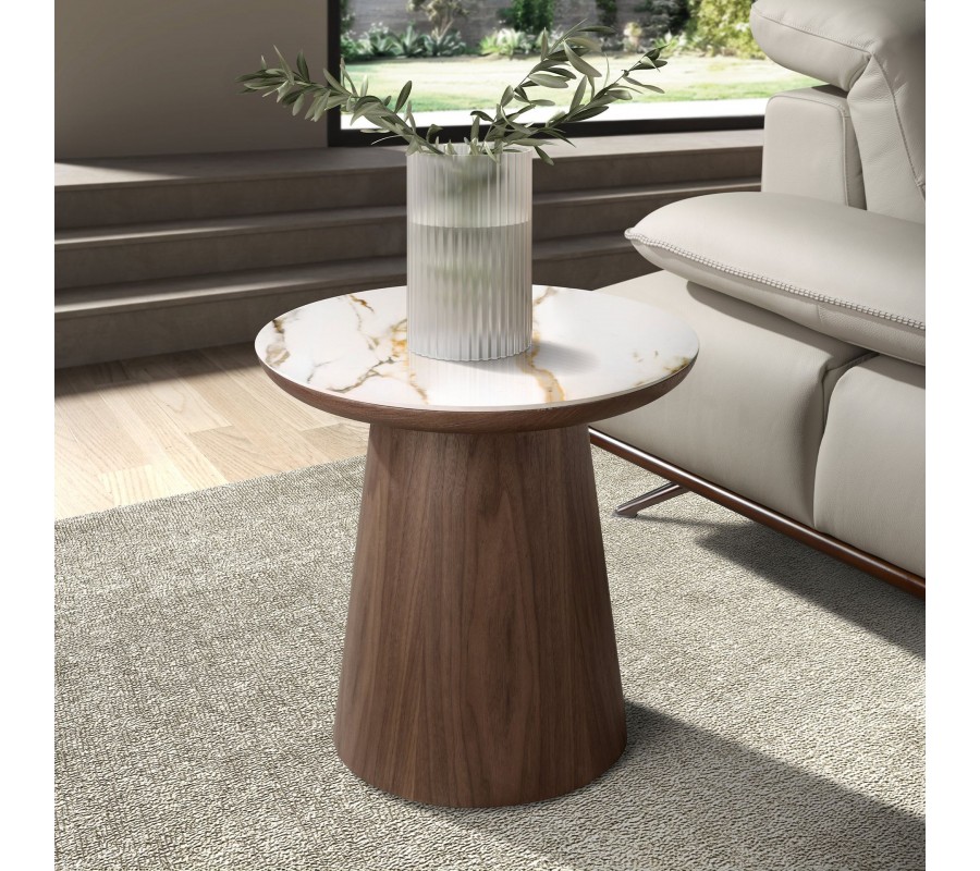 Luxusný moderný okrúhly príručný stolík Vita Naturale s porcelánovou doskou a kužeľovou nohou v hnedej farbe 50 cm