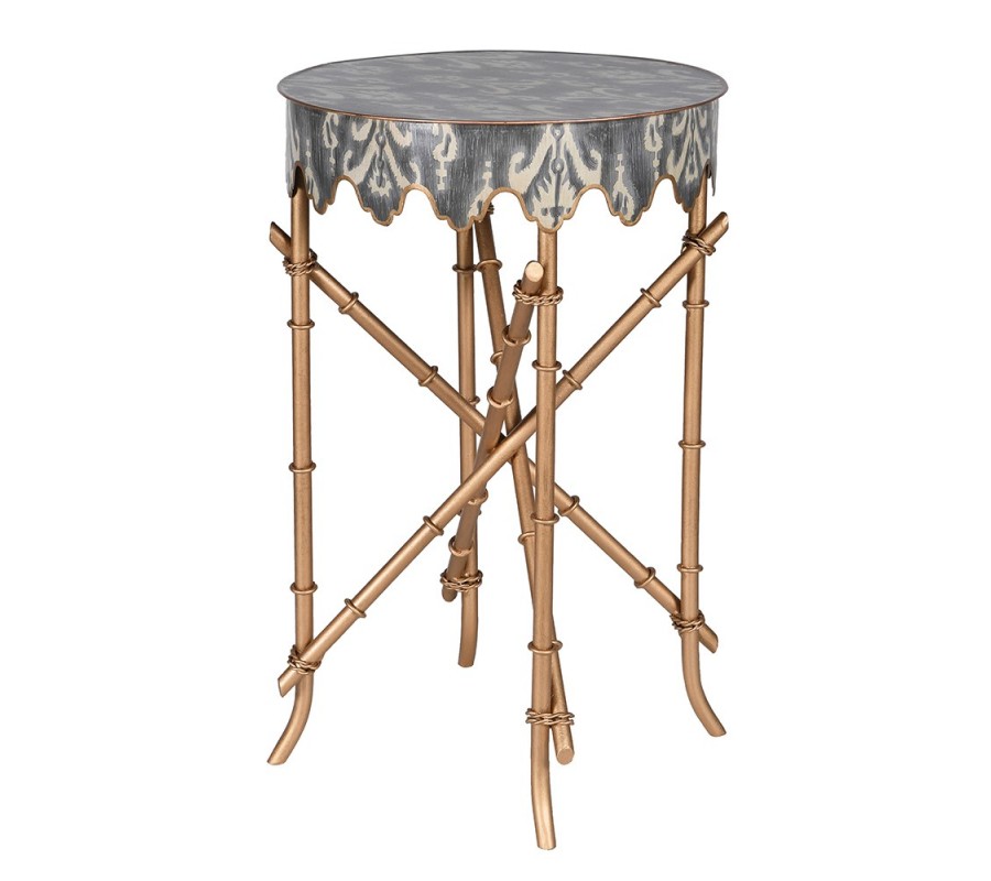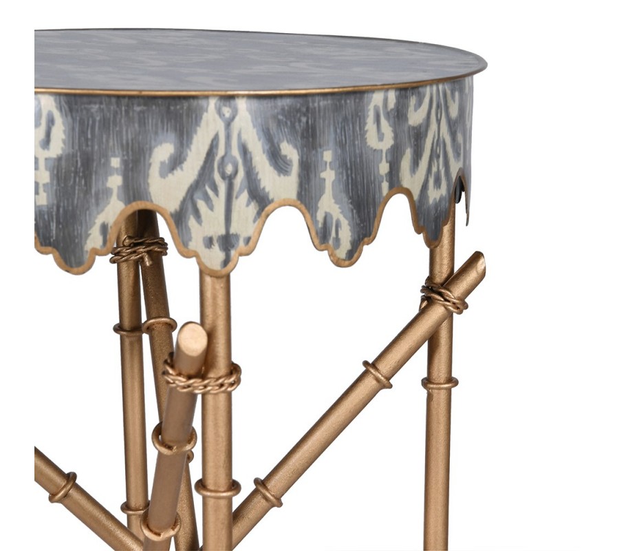 Má okrúhlu vrchnú dosku zo železa s povrchovou úpravou v podobe orientálnej kresby v modrom odtieni s bielymi ikatovými motívmi v tvare listových ornamentov, typických pre etno štýl. Okraj stolovej dosky je zakončený dekoratívnym oblúkovým rámovaním, ktoré dodáva stolíku jemný romantický a zároveň noblesný charakter. Po obvode je doplnený o zlaté lemovanie, ktoré podčiarkujú jeho glamour charakter.