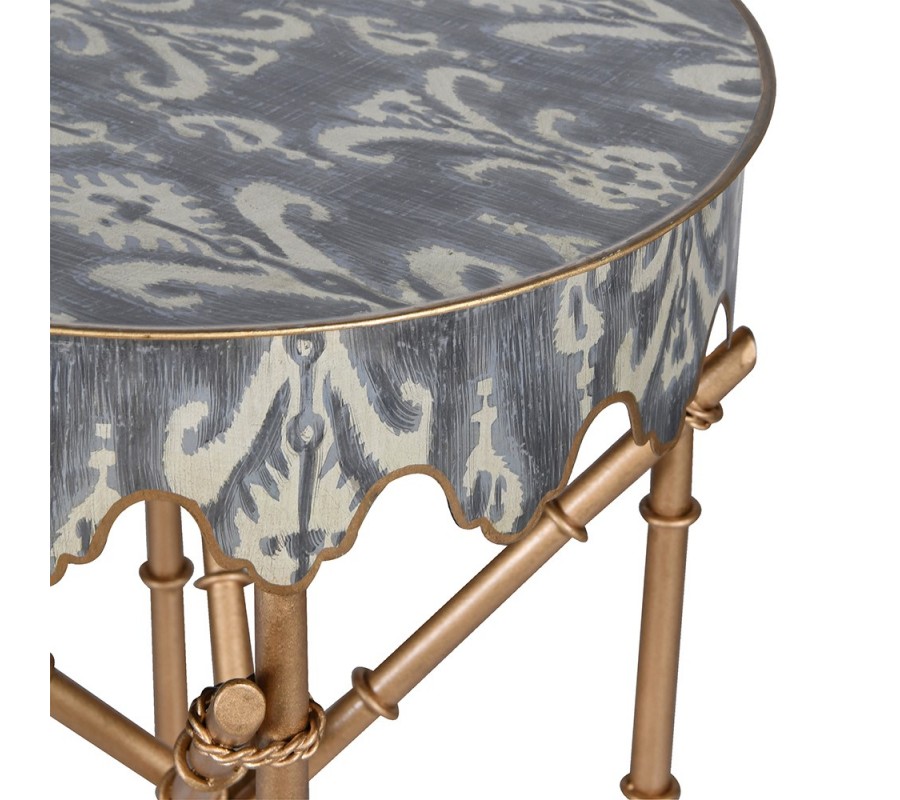 Etno modrý okrúhly príručný stolík Mirano s dekoratívnou kresbou zo železa v zlatej farbe s prekríženými nožičkami 51 cm