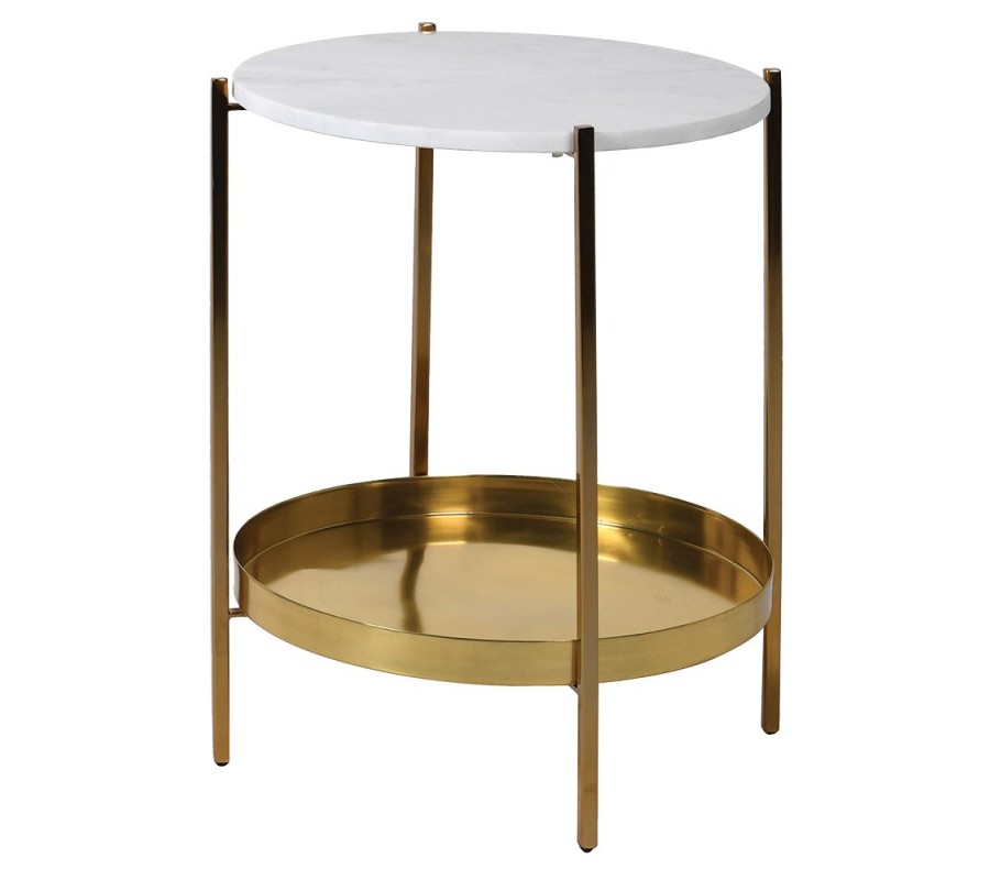 Glamour okrúhly biely príručný stolík Augustin s mramorovou vrchnou doskou s úložnou policou z kovu v zlatej farbe 53 cm
