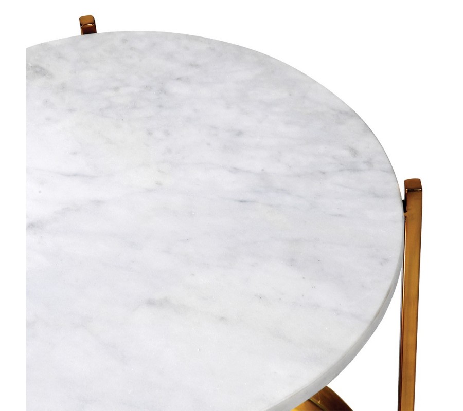 Príručný stolík Augustin v art deco štýle s prvkami glamour dizajnu, zaujme na prvý pohľad svojím okrúhlym tvarom a vyváženou kombináciou elegantných materiálov. Vrchná doska je vyrobená z prírodného kameňa v bielej farbe so sivým žilkovaním, čo vytvára jemný mramorový vzor, ktorý pôsobí luxusne, nadčasovo a dodáva stolíku vznešený charakter.