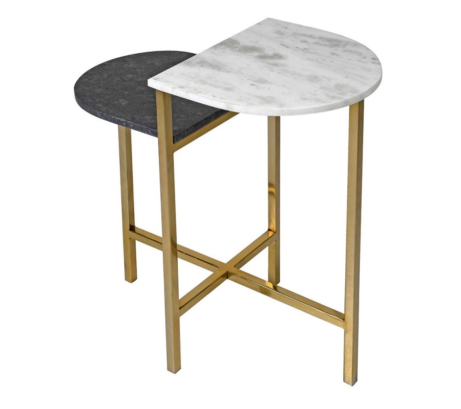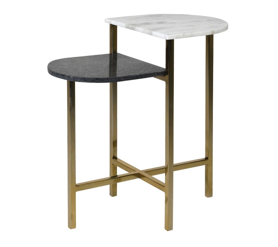 Štýlový dvojitý príručný stolík Duomarble vás osloví hneď na prvý pohľad svojim jedinečným dizajnom. Stolík sa skladá z dvoch navzájom prepojených stolíkov, ktoré vytvárajú zaujímavú konštrukciu. Je navrhnutý v štýlovom glamour a art deco dizajne. Na prvý pohľad zaujme svojím originálnym asymetrickým tvarom a kontrastnou kombináciou farieb a materiálov.
