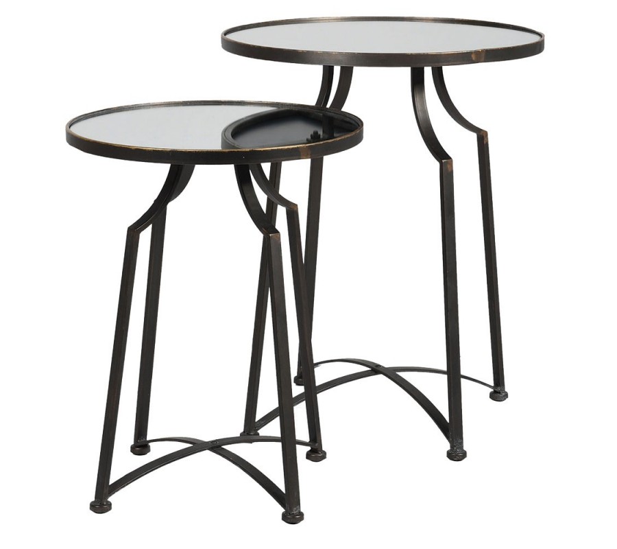 Vrchné dosky majú okrúhly tvar a sú osadené zrkadlom, ktoré elegantne odráža svetlo a dodáva stolíkom vzdušnosť aj jemný lesk. Konštrukcia je vyrobená z odolného železa v tmavohnedej až čiernej farbe s matným povrchom a zlatou patinou. Štyri štíhle nožičky sa v hornej časti mierne prehýbajú do oblúka, čím vytvárajú nápaditý tvar s elegantným charakterom. V spodnej časti sú prepojené priečkami do tvaru písmena X, ktoré zabezpečujú stabilitu a zároveň pôsobia dekoratívne. Vďaka svojim proporciám sa stolíky dajú čiastočne zasunúť jeden pod druhý, čo zvyšuje ich funkčnosť a flexibilitu.