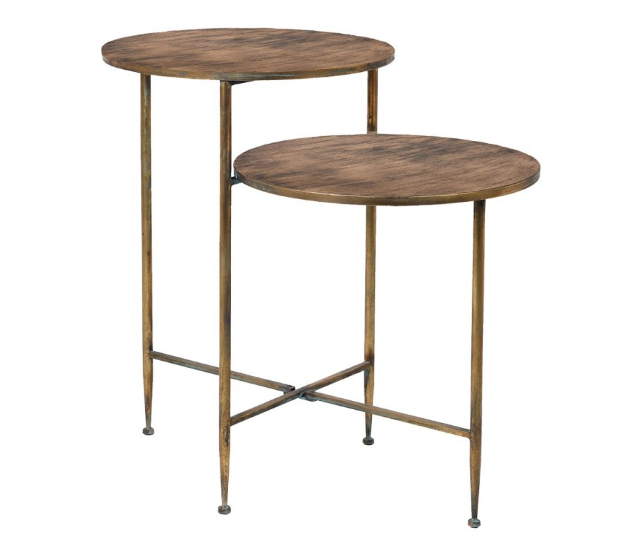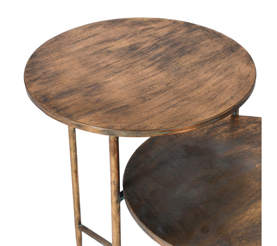 Pozostáva z dvoch prepojených okrúhlych dosiek umiestnených v rozdielnej výške, ktoré vytvárajú praktickú a esteticky zaujímavú kompozíciu. Stolík má medenú farbu s jemnými patinovanými detailmi a nápaditou povrchovou úpravou pripomínajúcou ťahy štetca, čo dodáva stolíku autentický vintage charakter s umeleckým nádychom.