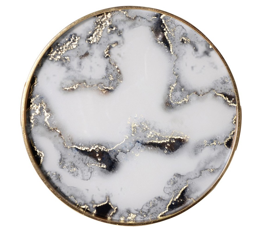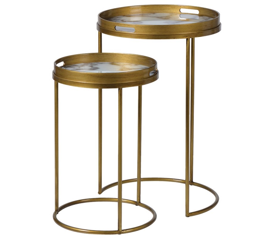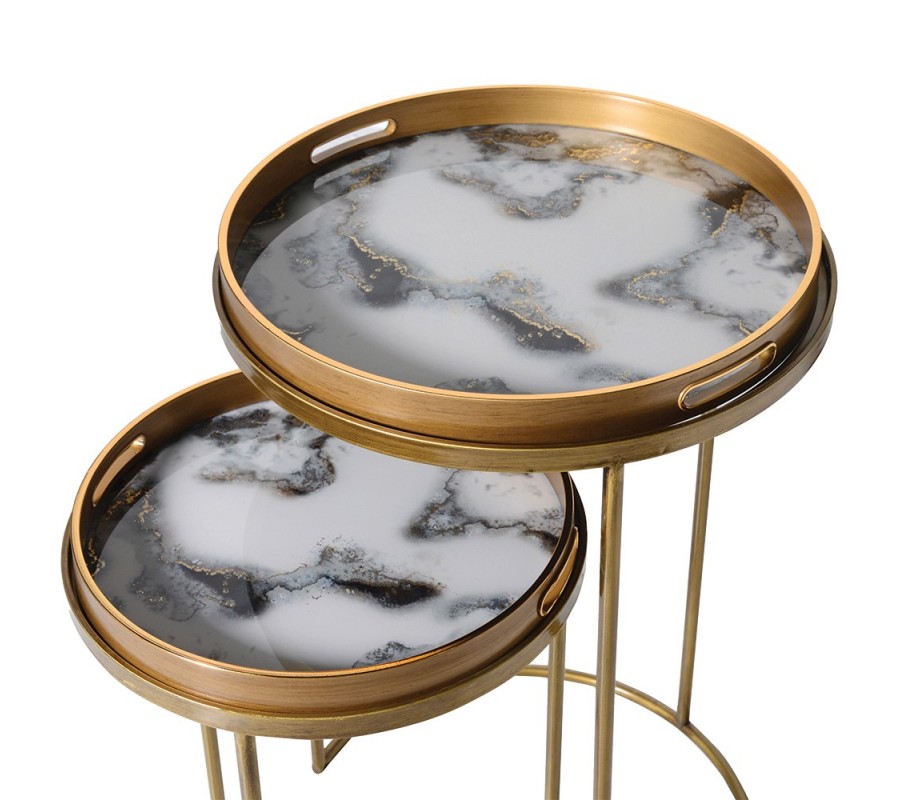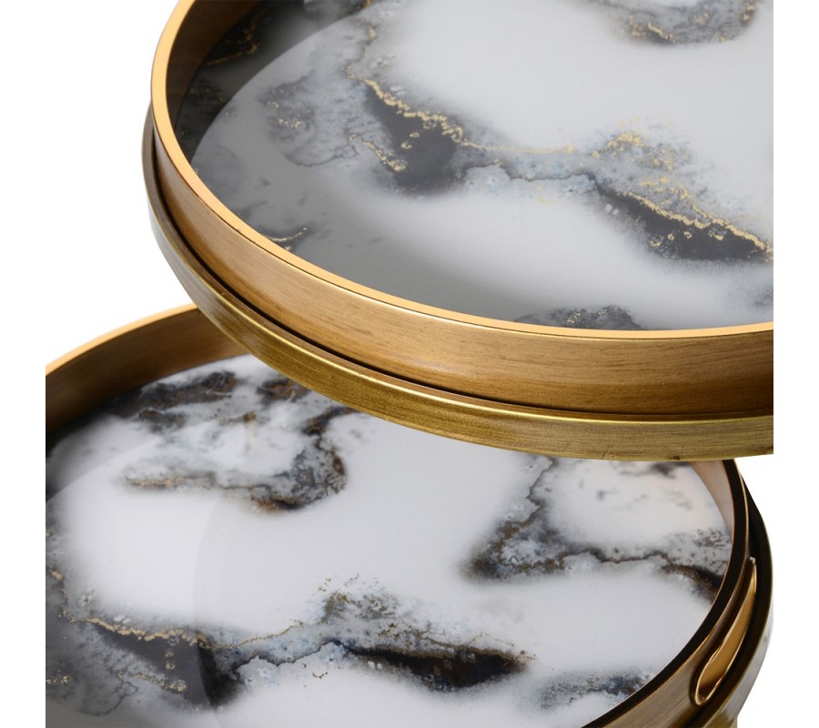 Oba kusy majú okrúhlu vrchnú dosku s dizajnom podnosu s vyvýšeným okrajom a vyrezanými úchytkami. Rovnako ako podstavy, aj vrchné dosky sú vyrobené z kovu v lesklom zlatom prevedení. Dno oboch podnosov pokrýva krásny mramorový dizajn s mliečnym bielym pozadím a tmavou, sivou až čiernou kresbou. Žilkovanie dopĺňajú zlaté detaily, ktoré korešpondujú s farbou konštrukcie. Dno je prekryté vrstvou skla, ktorá chráni dekor a zároveň poskytuje odolný a na údržbu nenáročný povrch.