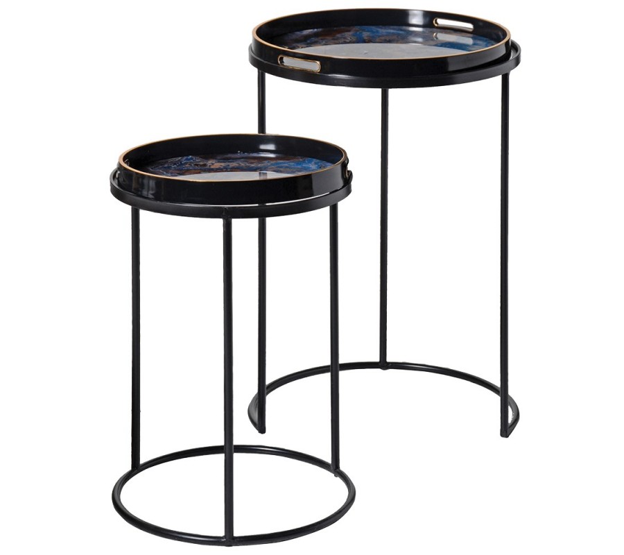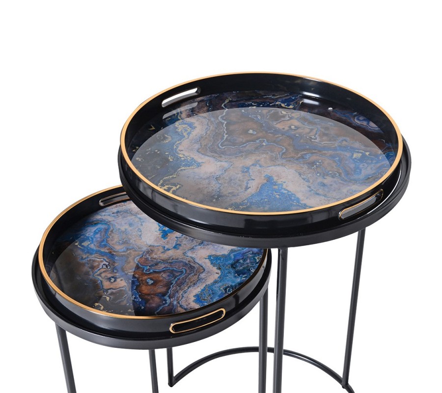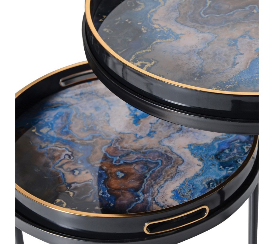 Glamour sada dvoch čiernych okrúhlych príručných stolíkov Maori s modrým mramorovým dizajnom a zlatými detailmi 73 cm