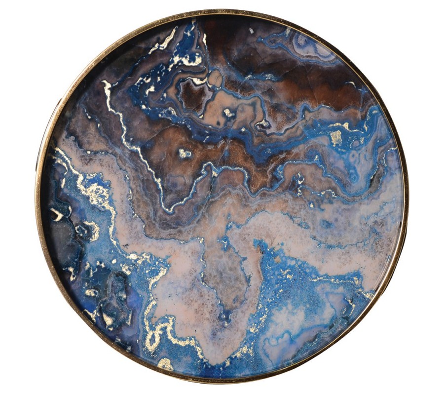 Dizajnu dominujú okrúhle vrchné dosky v tvare podnosu. Majú praktický vyvýšený okraj s vyrezanými bočnými úchytkami. Lesklú čiernu farbu krásne dopĺňa kontrastné zlaté lemovanie okrajov. Dno podnosu je prekryté sklom, ktoré zabezpečuje pevný a na údržbu nenáročný povrch. Zdobí ho bohatá a expresívna kresba mramoru v odtieňoch kráľovskej modrej, hnedej a bielej.
