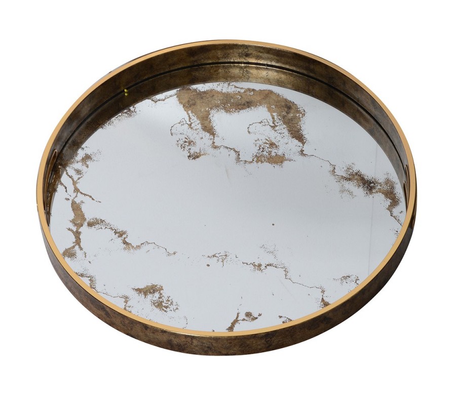 Vrchné dosky stolíkov sú tvorené okrúhlymi podnosmi s úchytkovými výrezmi na stranách. Ich vyvýšený okraj je vyrobený v rovnakom zlatom prevedení, ako aj podstavy. Dno podnosov prekrýva zrkadlové sklo, ktoré poskytne odolný a na údržbu nenáročný povrch. Zároveň má vysoko dekoratívny charakter a zdobí ho jemné patinovanie, pripomínajúce vzor mramoru.
