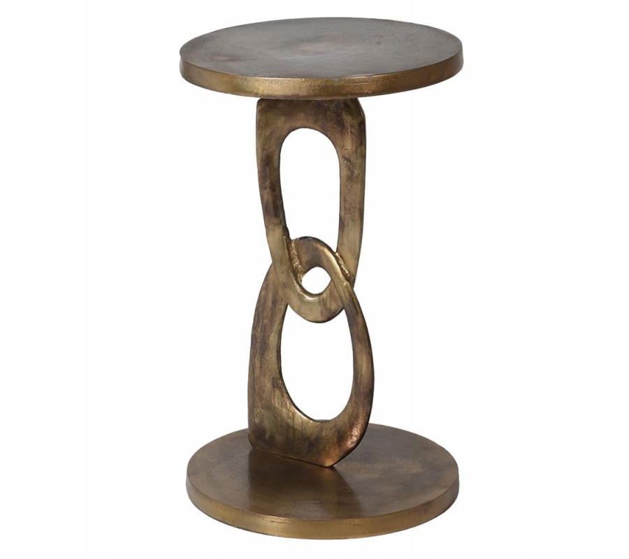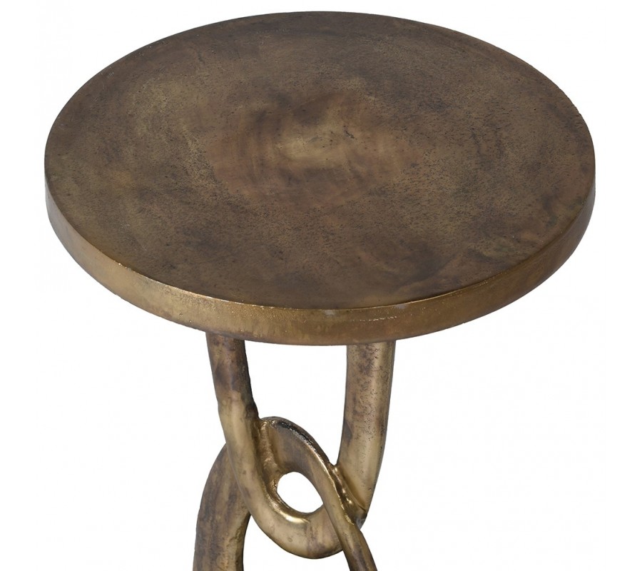 Dizajnový príručný stolík Semin zaujme originálnym sochárskym prevedením a výrazným vintage charakterom. Je vyrobený z kovu v zlatej farbe s jemnou patinou, ktorá mu dodáva hĺbku, eleganciu a nadčasový vzhľad. Okrúhla horná doska a okrúhla podstava vytvárajú stabilný a harmonický celok, zatiaľ čo stredová časť pripomínajúca reťaz so dvomi asymetrickými plochými kruhmi pôsobí umelecky a robí zo stolíka výrazný dizajnový solitér.