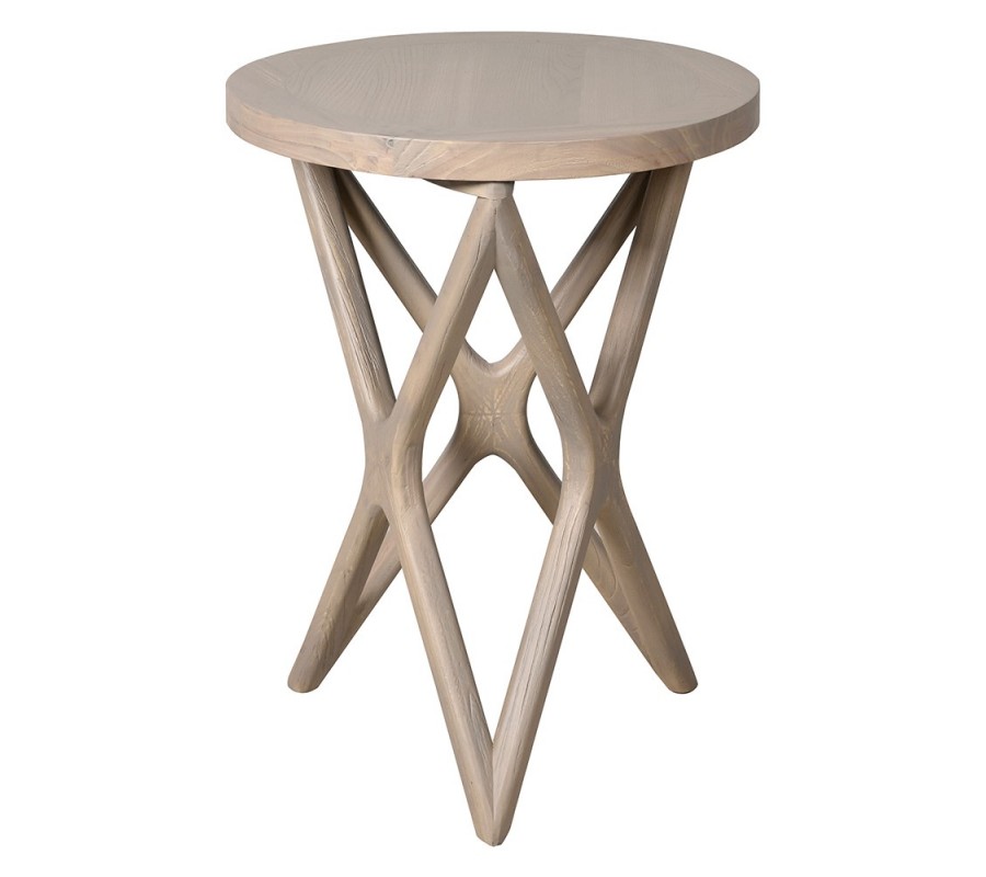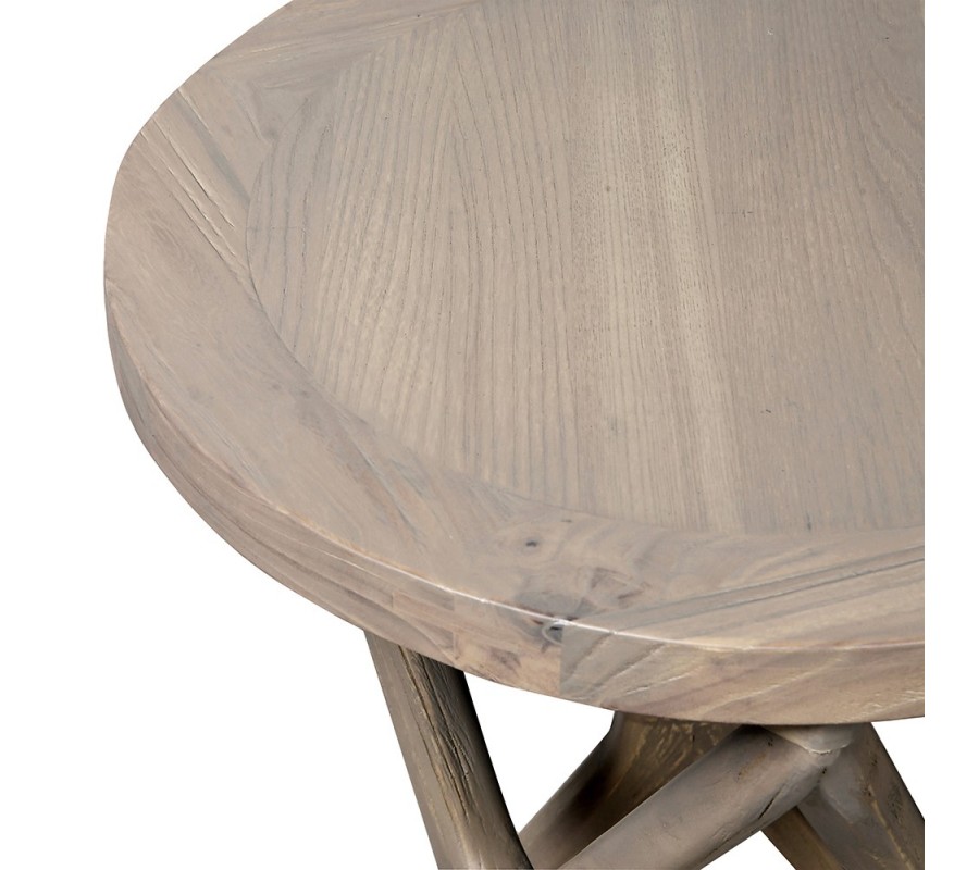 Stolík má okrúhlu vrchnú dosku s priznanou kresbou letokruhov, ohraničenú hladkým rámom. Do tohto minimalistického konceptu výborne zapadá aj použitie recyklovaného brestového dreva, ktoré je šetrné k životnému prostrediu a zároveň dodáva každému kusu unikátny charakter. Matný náter má elegantnú svetlú hnedú až krémovú farbu, ktorá sa ľahko kombinuje s ďalším nábytkom.