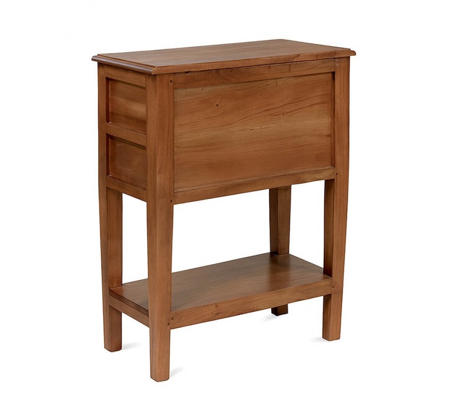 Stolík obdĺžnikovú vrchnú dosku, ktorá na stranách prečnieva cez úložný priestor ako dekoratívna lišta so zaoblenou hranou. Pod ňou sú v dvoch radoch umiestnené tri zásuvky s kazetovými čelami. Dve vrchné majú polovičnú šírku a minimalistické okrúhle úchytky z kovu. Spodná zásuvka je širšia a dopĺňajú ju dve visiace úchytky v tvare U.