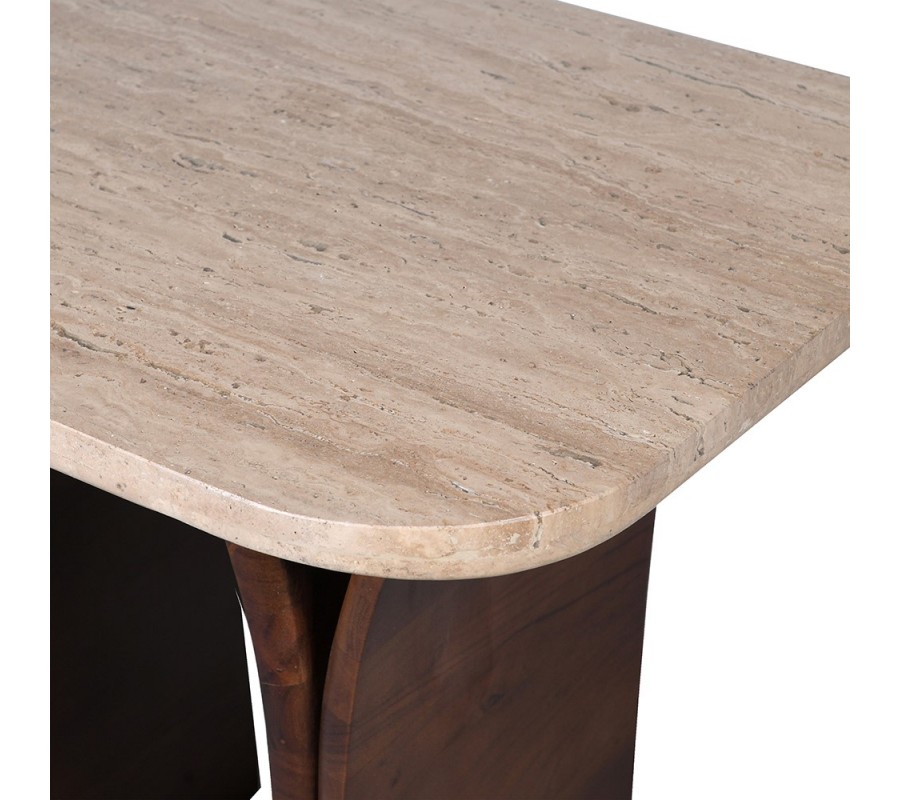 Luxusný moderný dizajnový príručný stolík Jedy z travertínového mramoru pôsobí elegantne, nadčasovo a architektonicky výrazne. Obdĺžniková doska so zaoblenými hranami je vyhotovená v jemnej béžovej farbe, ktorá zvýrazňuje prirodzenú kresbu kameňa, jeho póry a jemné farebné nuansy. Travertín dodáva stolíku exkluzívny charakter a prirodzenú noblesu, pričom každý kus je vďaka prírodnému materiálu originálom.
