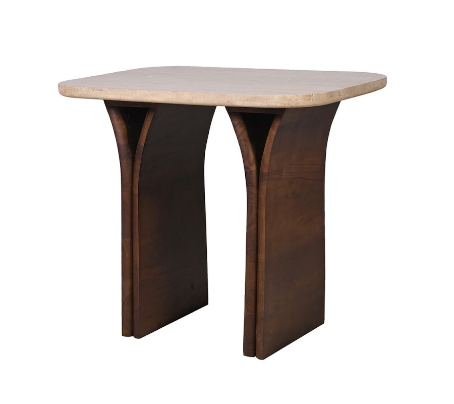 Stolík stojí na dvoch mohutných nohách z masívneho akáciového dreva v hnedej farbe. Nohy sú pod doskou širšie a smerom nadol sa postupne zužujú, čo zabezpečuje stabilitu a zároveň vizuálnu ľahkosť celku. Ich predná časť má výrazný dutý trojuholníkový tvar, ktorý dodáva stolíku moderný, sochársky výraz a podčiarkuje jeho architektonický dizajn. Kontrast chladnej kamennej dosky a teplého prírodného dreva pôsobí vyvážene, prirodzene a veľmi sofistikovane.
